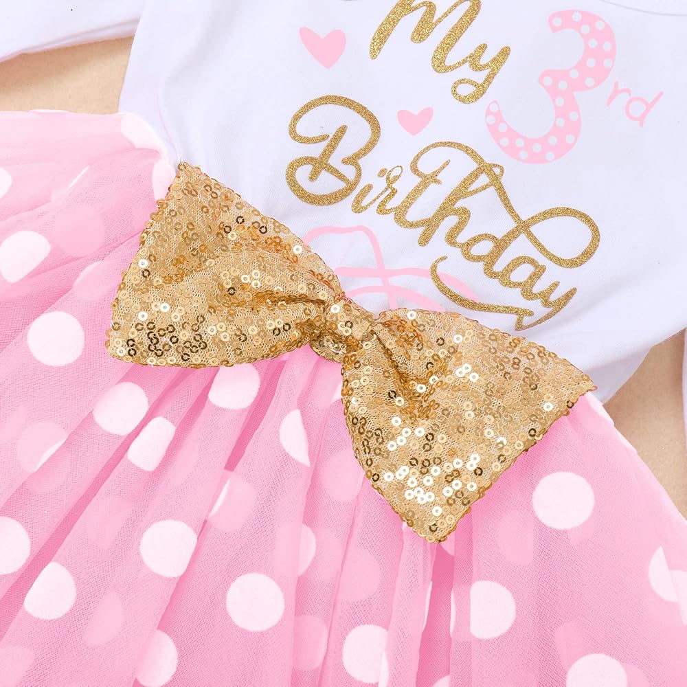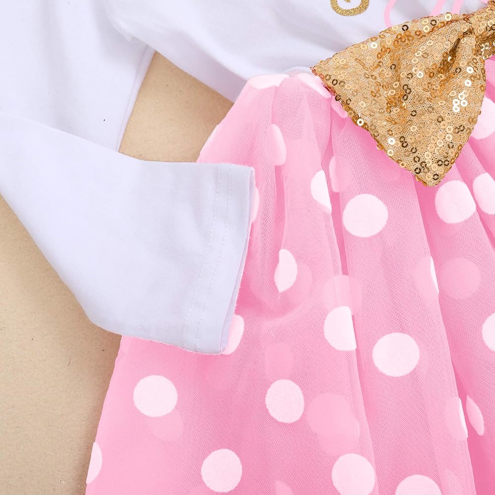 ★ 【Baby Girl Clothes Set】Tutu Beautiful One-Piece Sundress,Long sleeve round neck tops with chic glitter shiny letters "My 1st/2nd/3rd Birthday"print and cute cartoon folral,stylish and adorable.Multi-layer tulle spliced skirt,Vintage polka dots on the tulle skirt ,elasticated waist design, embellished with a glittering sequin bowknot.This adorable celebratory dress is comfortable, soft and cute, creating precious memories for years to come,give your little girl comfortable wearing experience