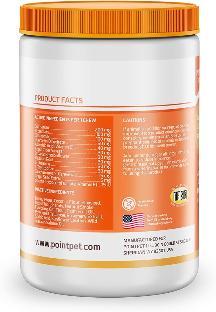 Calming Effects: With ingredients like chamomile, organic passionflower, valerian root, L-theanine, and L-tryptophan, our supplement provides calming effects to your pet.
