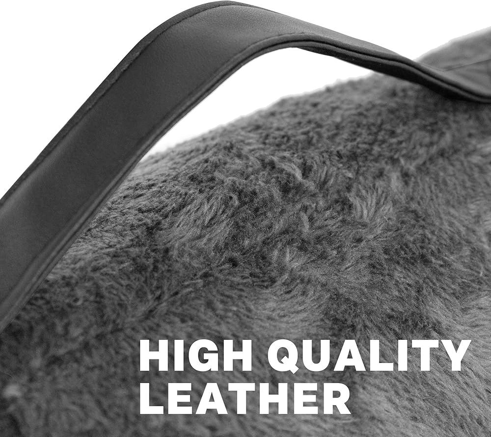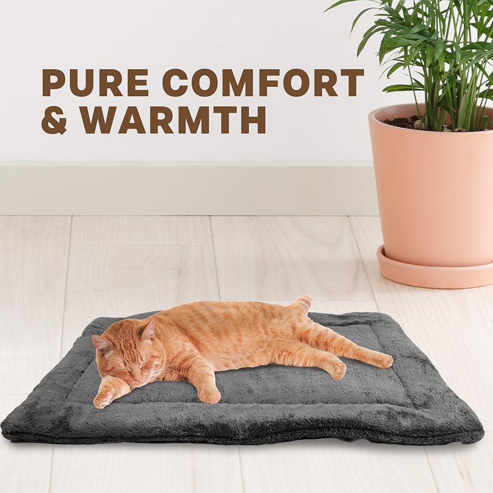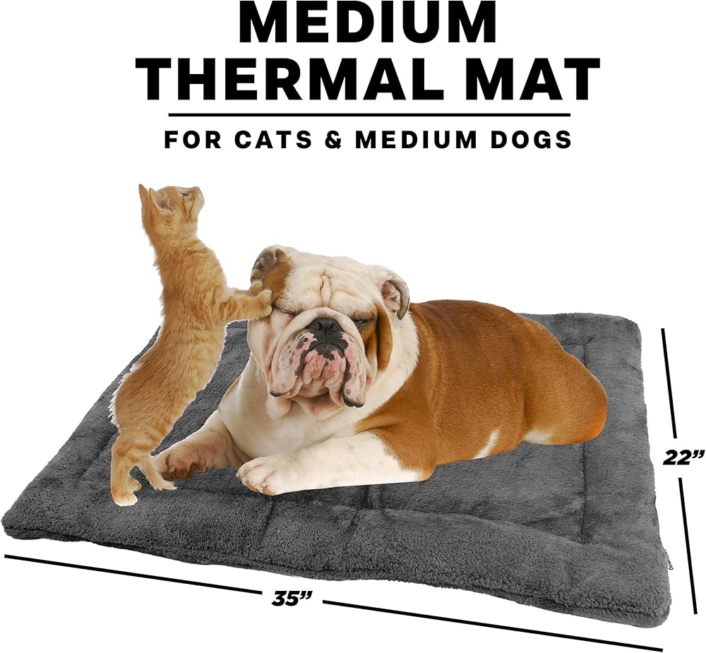 EFFECTIVE WARMING: This mat has the ability to keep your furry friend warm and toasty. Pets are naturally drawn to heated surfaces, so this self-warming pad will be your cat or dog's favorite place to nap, lounge, or just hang out. NO WIRES OR PLUGS: Many warming mats require electricity, which can reduce longevity, cause burns, and risk fire in your household. Our Thermal Crate Mats re-use your pets own body heat to generate consistent warmth, using a mylar layer within each pad. You will be shocked how warm this mat gets without any wires, plugs, or batteries. SOFT PLUSH: In addition to the warmth, your pets will love the 2 layer super-soft plush material that covers the mat. Easy to wash and durably made, our Thermal Crate Mat will become a staple in your household. CRATE & TRAVEL READY: Designed to be used inside and outside of cages, these Thermal Crate Mats are specifically designed to fit into common sizes of dog kennels. Just choose the correct size for your pet. And for when you are out of the house, these mats even include a handle made from premium leather for easy travel. VARIETY: We have multiple colors and sizes so just choose the correct size for your house, crate, and life. Available in both Brown and Grey, the Small Size is 29in x 20in, the Medium Size is 35in by 22in, and the Large Size is 42in x 27in. Why choose our Thermal Crate Mats? Keep your fur-child warm and toasty with this self-heating crate mat Never worry about the safety of your pet or household! These mats include no fire hazards like cords, wires, plugs, or batteries Ultra-soft plush padded material will make your cat or dog feel like royalty Designed to fit in most standard sized crates Comes with complementary carrying handle made of premium stitched leather With multiple colors and sizes, select whichever mat best fits your house's decor, your dog's crate, and your lifestyle in general.