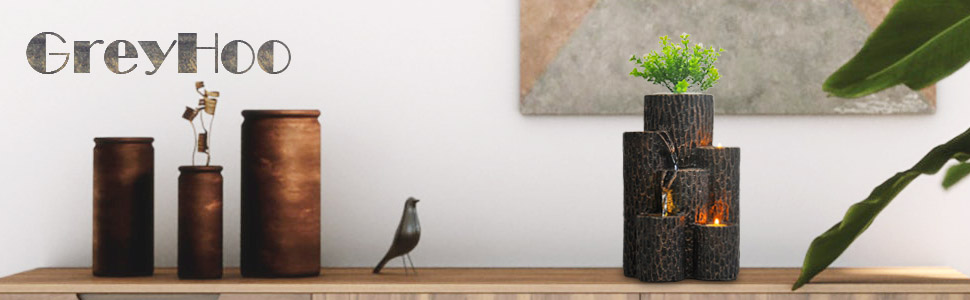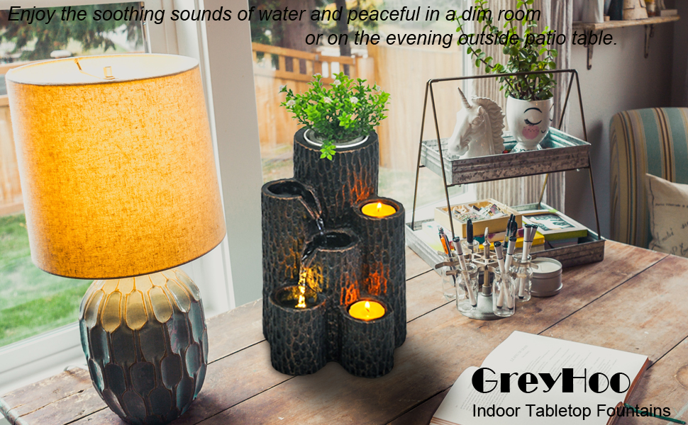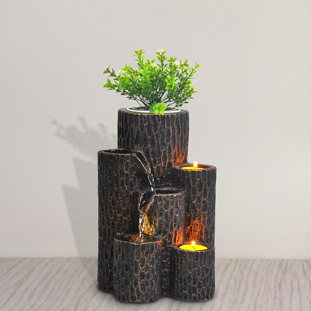 DECORATIVE TABLETOP FOUNTAIN: Features a multi-tier pillars design and 2 pillars for holding candles (Candle are not included) with an interior pump that keeps the water flowing. 3-layer pine bark-like pillars layer creates a soft and soothing water flow. This indoor fountain suitable to place in office or hotel as room decor. It is a small fountain that creates a perfect artistic conception. bowl for an ever-changing fountain scene giving it a more natural look