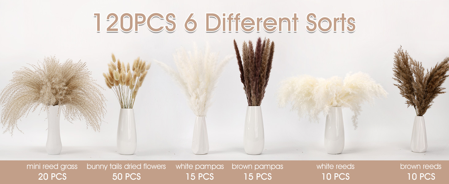 【DIY ARBITRARILY】Carefully selected 6 kinds natural dried pampas grass bouquets have 120 pcs in total, with an average length of 17.5” (vase is not included). They can be easily cut into different lengths to adapt your vase. You can also mix and match them arbitrarily with other ornaments. Let you create your unique and dreamy romance.