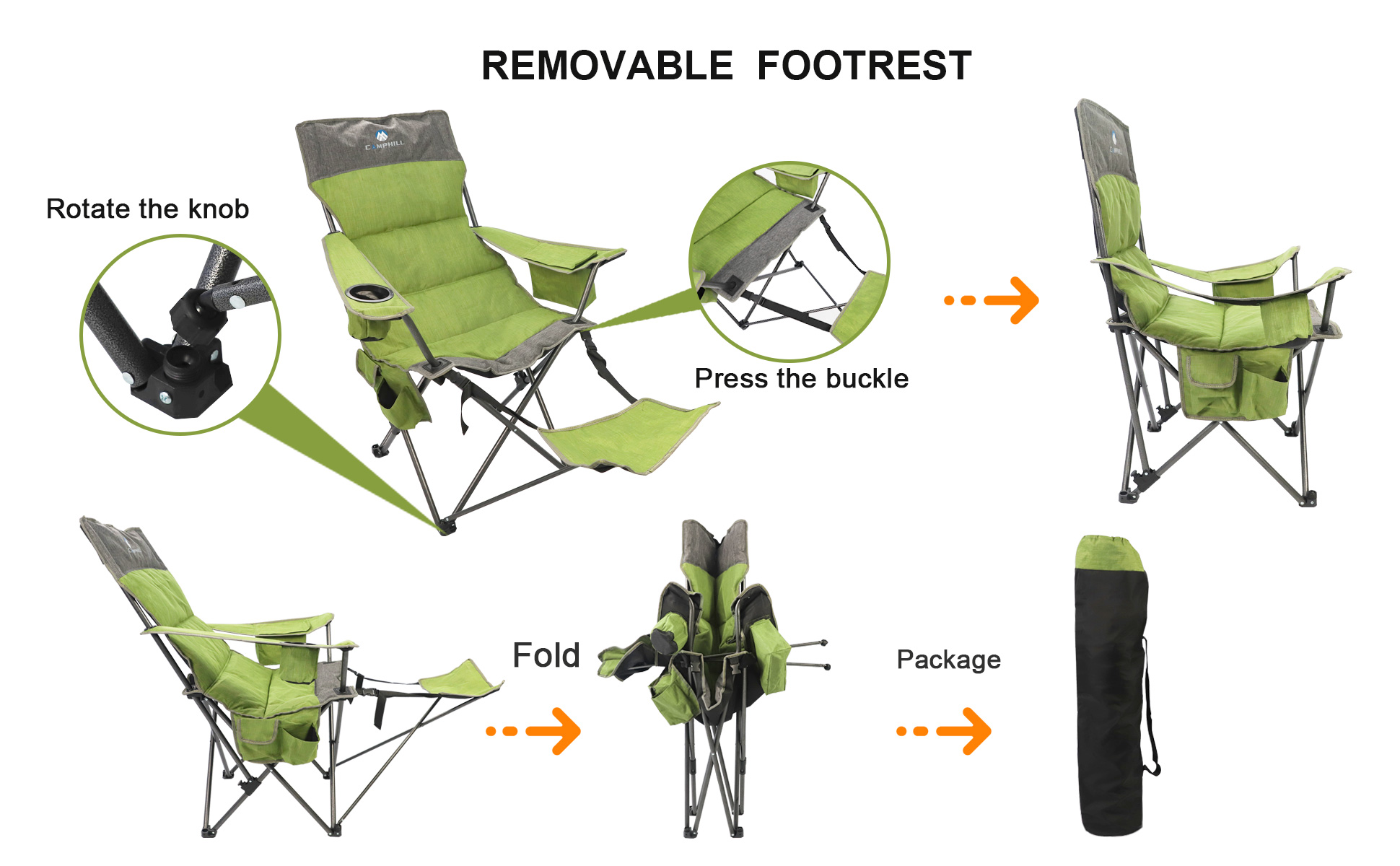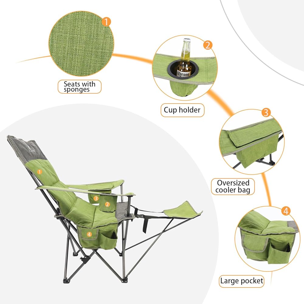 【ADJUSTABLE BACK】: The camping chair has an adjustable inclined back design that provides strong and comfortable back and leg support. The back can be adjusted from 90 degrees to 125 degrees to accommodate your specific demands and make the chair more comfortable to use.