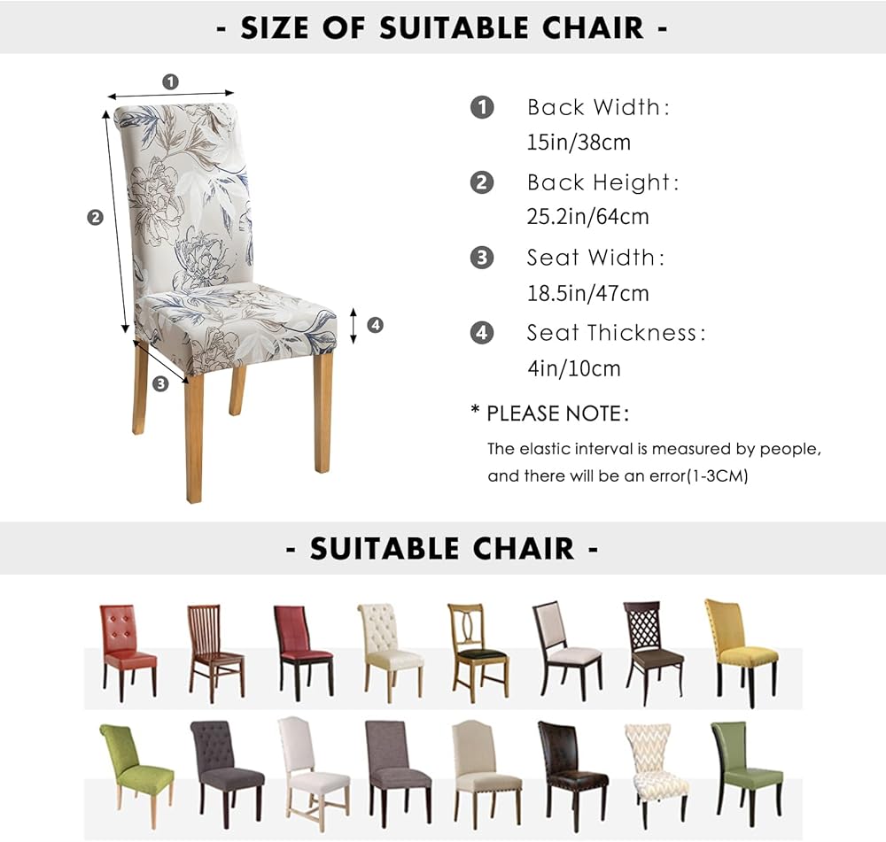 ✔Dining Chair Cover Size: Stretch universal kitchen chair covers fit well for normal and high back parson chairs. Chair-back height 45-60cm/18-23", Back Width 38-48cm/15-19", chair seat length and width 38-48cm/15-19" and thickness 4-10cm/1.5-4". Dining Bench Cover Size: Rectangular Bench Slipcover fit dining bench length is 42-51 in / 107-130 cm, width is 14-16 in / 36-40 cm; bench thickness is 2-6 in / 5-15cmKindly measure your chairs before ordering.