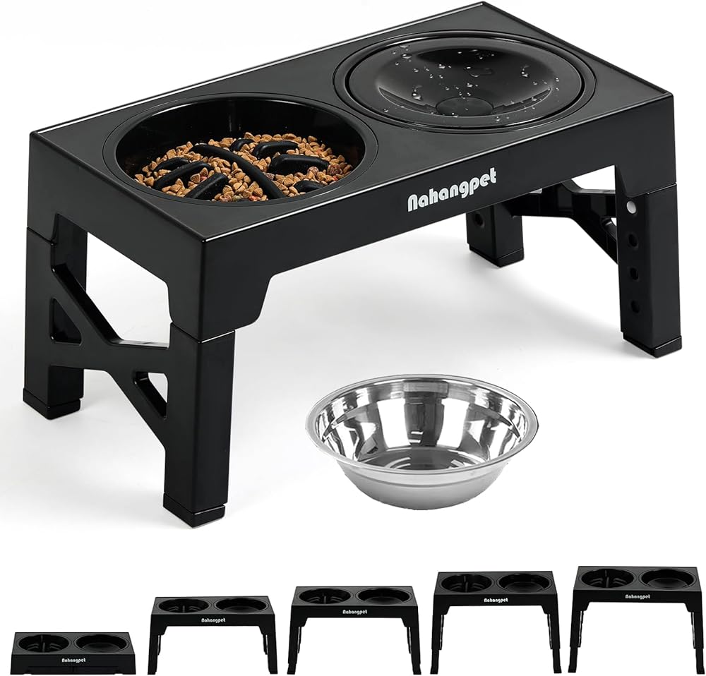 3-in-1 Elevated Slow Feeder Dog Bowls for Food and Water, 5 Heights Adjustable Raised Dog Bowls, Non-Slip, No Spill, for Small Medium Large Dogs and Cats(Black)