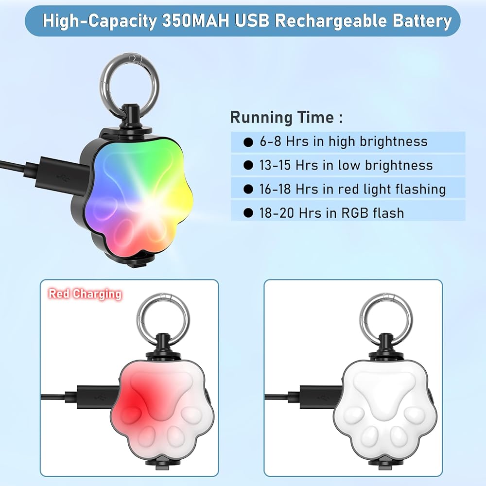 【USB Rechargeable & Lightweight】 When fully charged, the battery life of this led dog collar light can last up to 20 hours. It can last for 6-8 hours in high brightness, 13-15 hours in medium brightness, 16-18 hours in red light flashing, and 18-20 hours in RGB switching mode.There is no potential applied to a dog's neck by the 1 lb dog light.