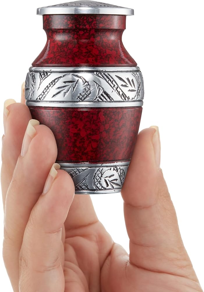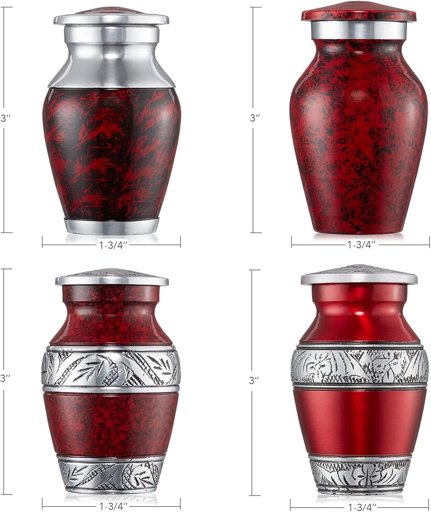 Keepsake Size: Our miniature urns are the ideal size for sharing a memorial keepsake with loved ones. Also can be used for scattering a portion of cremated remains. Urn Measurements: 3" H x 1-3/4" W. Lid Opening: 1" W. Base Diameter: 1" W. Weight: 1/5 lbs. Each urn holds approximately 8.5 cubic inches/ 2-1/2'' tablespoons of memories.