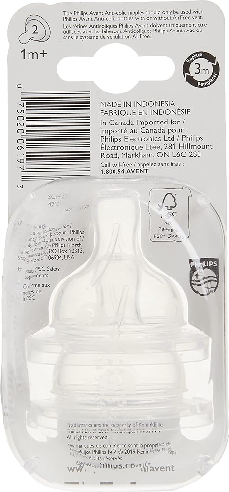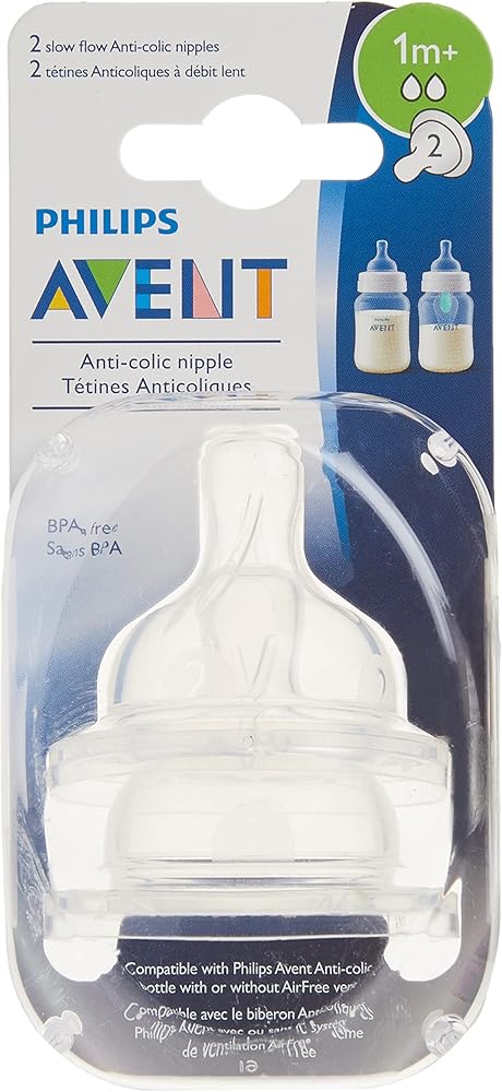 Philips Avent SCF422/27 Anti-colic baby bottle Slow Flow Nipple lets infants control the flow of milk like with breastfeeding, which can reduce spit-up and overeating. Philips Avent's anti-colic valve flexes to keep air in the bottle and out of your baby's tummy, a feature that reduces fussing and colic. In a clinical trial, two-week-old infants fed with a Philips Avent Anti-colic baby bottle experienced less colic than babies fed with a conventional bottle, with the greatest difference seen at night. Appropriate for babies at least 1 month old, these dual-hole nipples offer a slow flow. The nipple is made of flavorless, odorless silicone that resists discoloring and stickiness. The nipple's soft, rounded shape promotes feeding for babies who nurse from both the breast and a bottle. The Anti-colic baby bottle BPA Free nipples are dishwasher safe and can be sterilized by boiling for five minutes or by using a Philips Avent steam sterilizer.