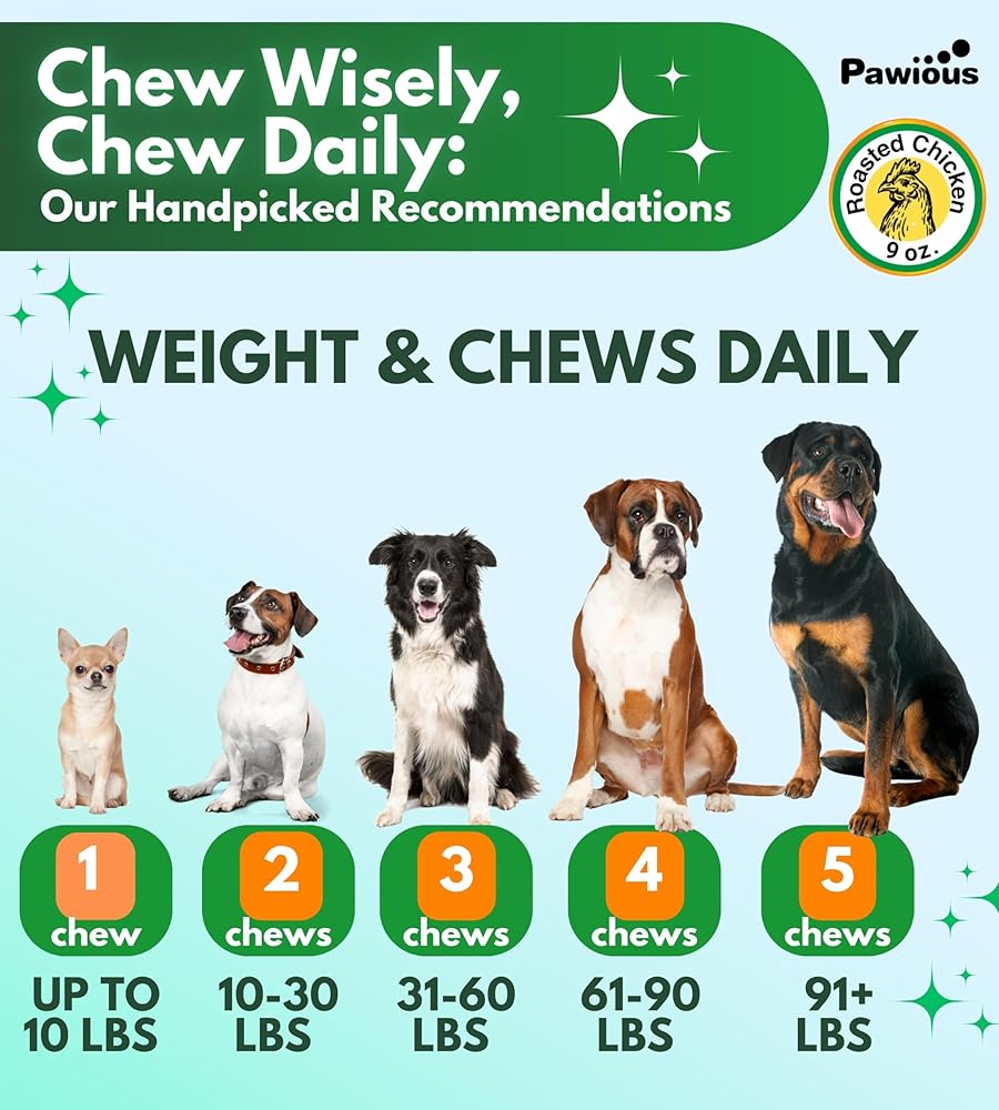 【Easy and Convenient】Say goodbye to struggling with pills, capsules, or powders. Each jar contains 120 tasty joint health chews with roasted chicken flavor, offering 1 to 4 months' supply depending on your dog's size.