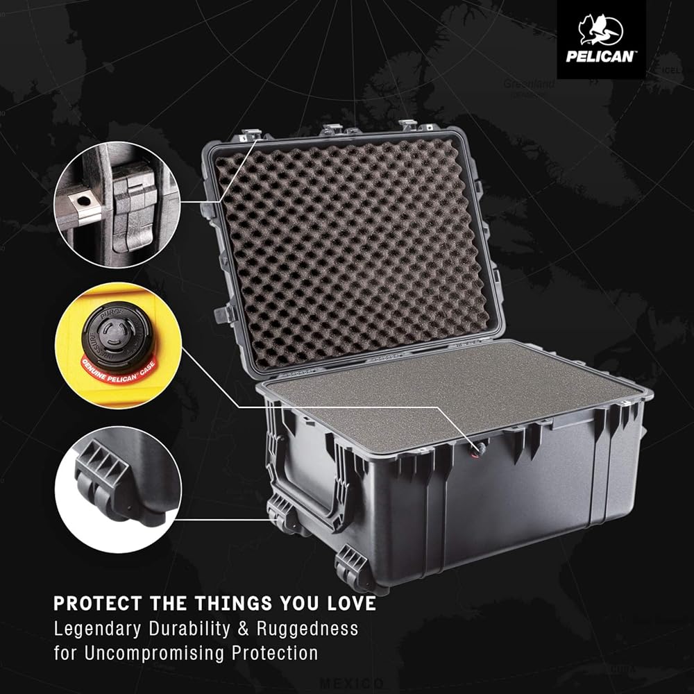 1630WF Color: Black, Dividers: Foam Pictured in black Features: -Equipment case with foam or dividers.-Available in Black, Od Green and Desert Tan.-Watertight, crushproof, and dust proof.-Open cell core with solid wall design - strong, light weight.-Automatic pressure equalization valve.-O-ring seal.-Comfortable rubber over-molded handle.-Stainless steel hardware and padlock protectors.-Three level Pick 'N' Pluck with convoluted lid foam.-Personalized nameplate service available.-Unconditional lifetime guarantee of excellence.-Fold down handles.-Retractable extension handle.-Four strong polyurethane wheels with stainless steel bearings. Dimensions: -Exterior dimensions: 24.19'' H x 31.25'' W x 17.5'' D.-Interior dimensions: 21'' H x 27.69'' W x 15.5'' D.