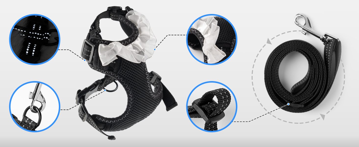 😸Soft and Stylish😸- This chest and back harness is made of lightweight, soft and breathable polyester mesh fabric, which is soft and has a rebound effect. With delicate lace edges, it has a very fashionable style. Give your furry friend a stylish and easy-to-use harness vest, and enjoy worry-free outdoor time together.