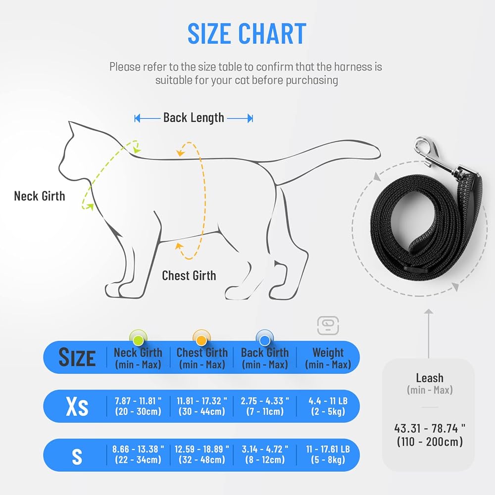 😸Exquisite Workmanship😸- The product is made of exquisite stitching technology and the reflective design of the webbing enhances the safety of nighttime use. Users can easily and safely guide their pets, and the traction rope will not get tangled, making it smart and convenient to use. The product comes in XS and S sizes, and the size chart details the measurement range of the neck, chest and back, helping users choose the right size. However, it is still necessary to leave an error of1-2 cm (0.39-0.79 inches) when using it.