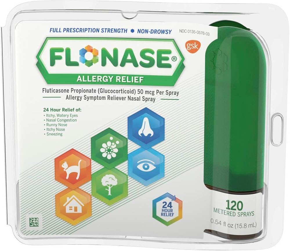 Once-daily Flonase Allergy Relief Nasal Spray is the first and only nasal spray proven to offer 24-hour relief of both nose- and eye-related allergy symptoms. Flonase helps block 6 allergic substances, not just 1. Flonase is both non addictive and non-drowsy. Full prescription strength Flonase Allergy Relief is available without a prescription; there's nothing standing between you and effective allergy relief. It doesn't matter if you suffer seasonally or all year long--with Flonase, you are greater than your allergies. Flonase Allergy Relief Nasal Spray, 0.62 fl oz, 144 Metered Sprays:Full prescription strengthNon-drowsy24-hour relief of nasal congestion, runny nose, itchy nose, sneezing and itchy, watery eyesWorks directly in the nose without traveling through the bodyCan be used every day144 metered sprays