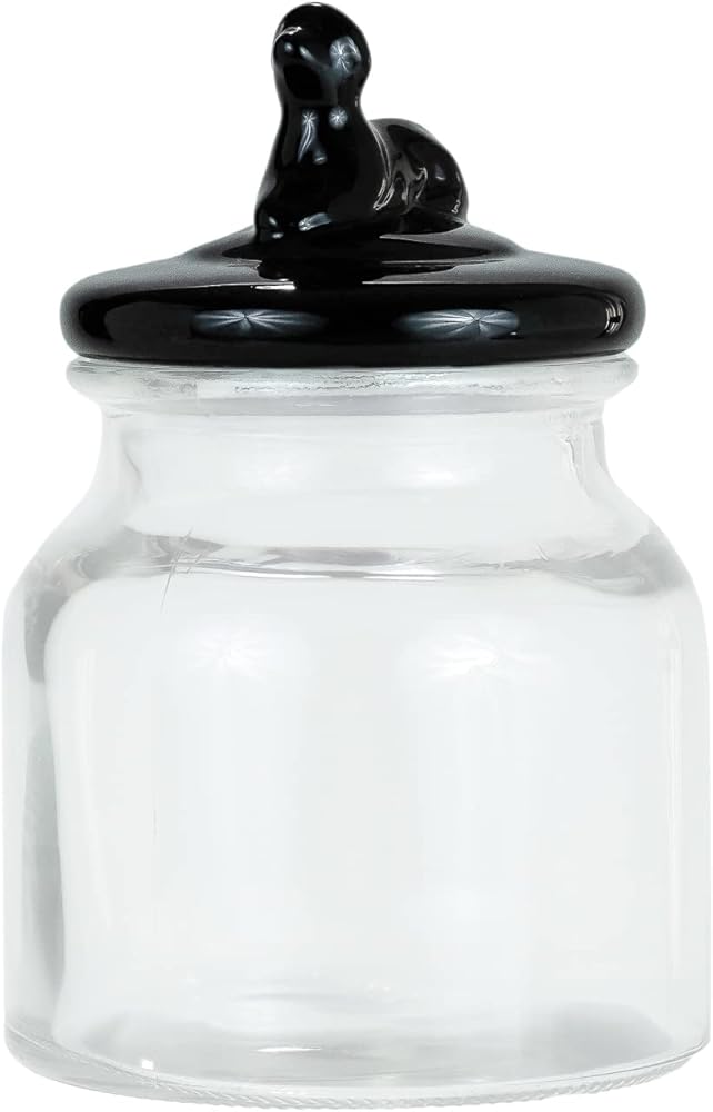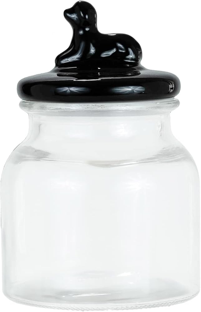 Introducing the Amici Pet Cosmopawliton Glass Canister Black, the perfect solution for keeping your furry friend's treats fresh and easily accessible. Keep your pet's food fresh and dry in this large glass jar with an airtight lid featuring a silicone ring. The generous capacity of 52 ounces allows you to store a variety of dog treats, accommodating the needs of both large and small dogs. Add a vintage touch to your kitchen countertop with this cute dog treat jar, featuring a charming dog figurine on the lid. The dog handle on top allows for convenient access to treats while keeping them sealed and secure from your pet—this pet treat jar ensures that your good boy or girl always enjoys fresh and delicious treats. Not only is this glass dog treat jar practical and stylish, but it is also made with your pet's safety in mind. Crafted from sturdy and food-safe glass, it provides a durable storage solution for your pet's treats. The rubber-lined lid ensures that hard or soft treats, dental sticks, or kibble remain moisture-free and delicious. Plus, it's easy to clean—simply place it in the dishwasher for hassle-free maintenance. Elevate your home decor with this versatile dog cookie jar. It's not just for the kitchen; it can also be displayed on your office desk, pet station, console table, or anywhere you treat your pet. The Amici Pet Cosmopawliton Glass Canister Black is a perfect gift for any pet owner who wants to keep their dog's treats fresh and their home stylish. Order yours today and give your four-legged companion the treat storage they deserve!