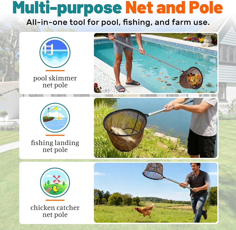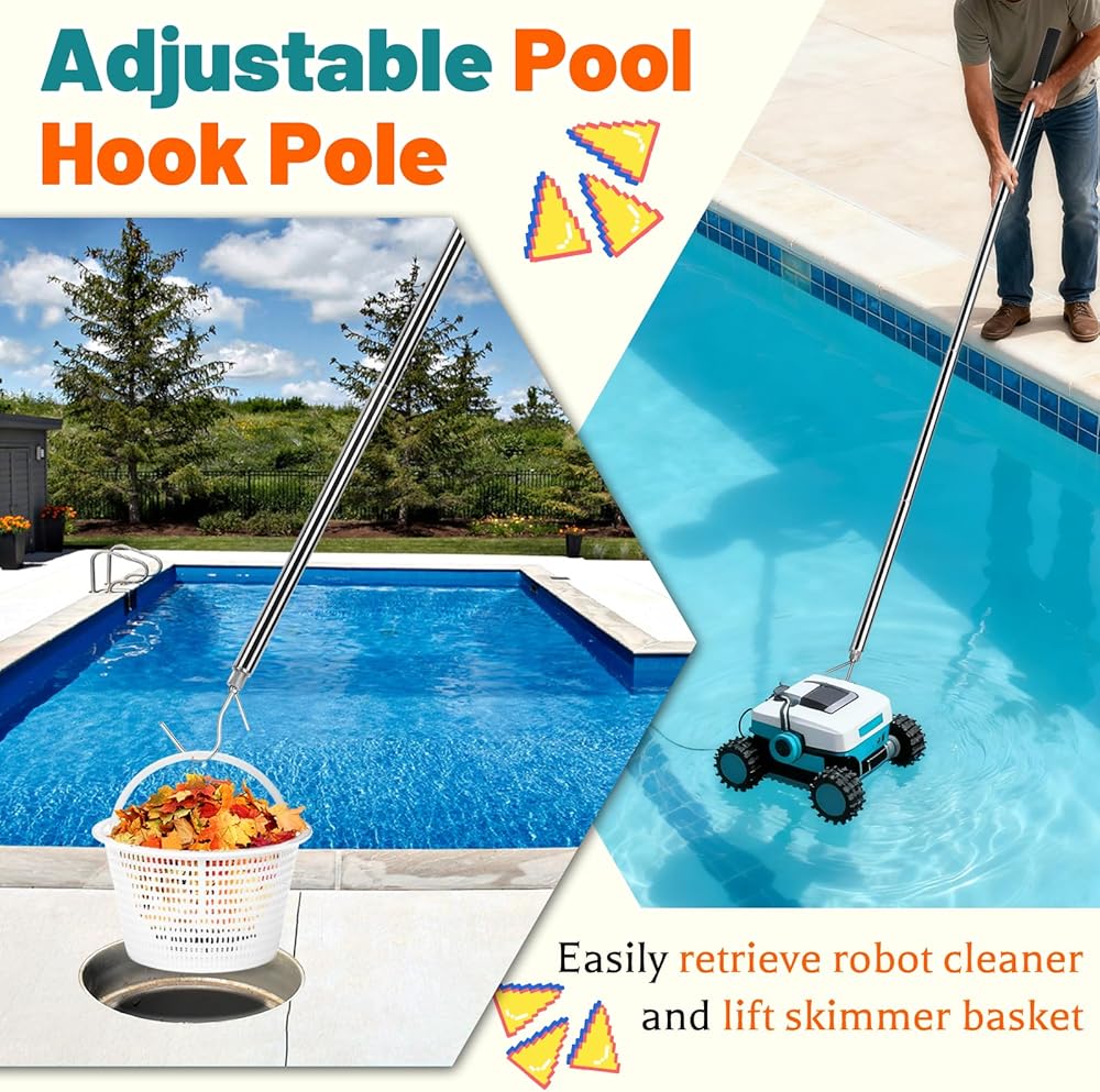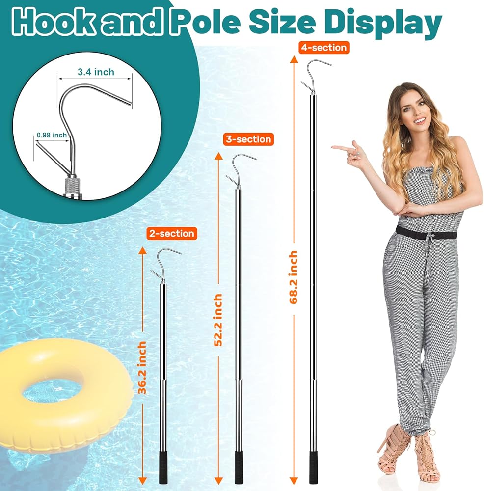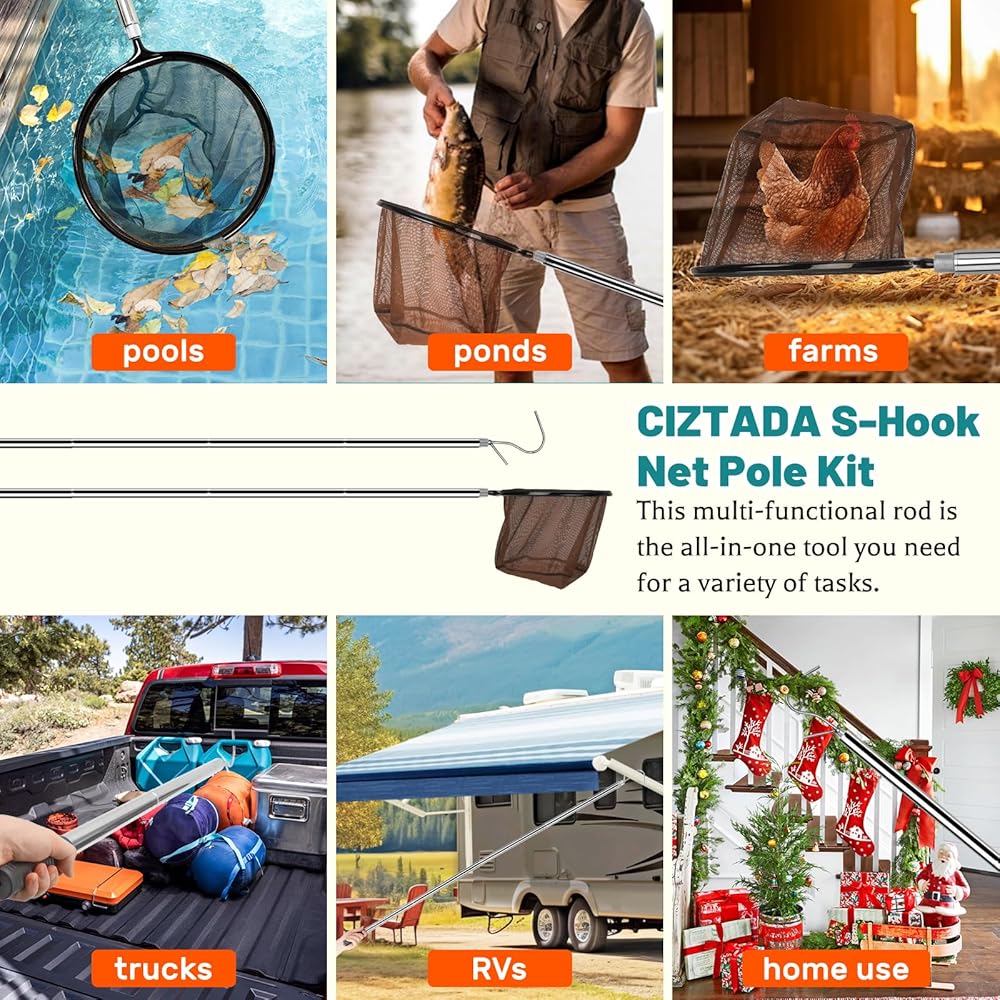 65 Inch Adjustable Pole with Net and Hook Multi-functional Pole Net Hook Tool Pool Skimmer Pole Net and Sturdy Truck Cargo Retrieval Pole Combo for Pool, Pond, Hanging and Removing Heavy Items