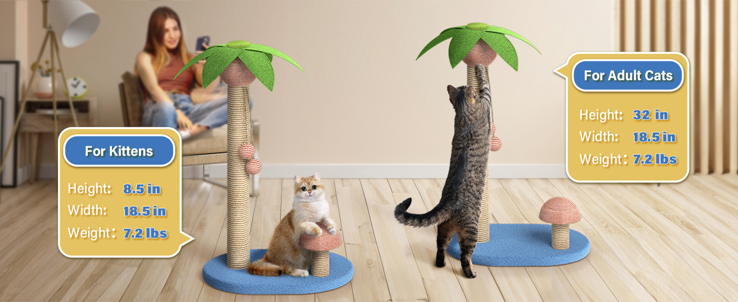 【🌴Companionship is the best gift】This cat scratching post can accompany kittens into adulthood. The short cat scratcher is 8 inches high, suitable for kittens to play with; The tall scratching post is 32 inches, enough for an adult cat to stretch out.