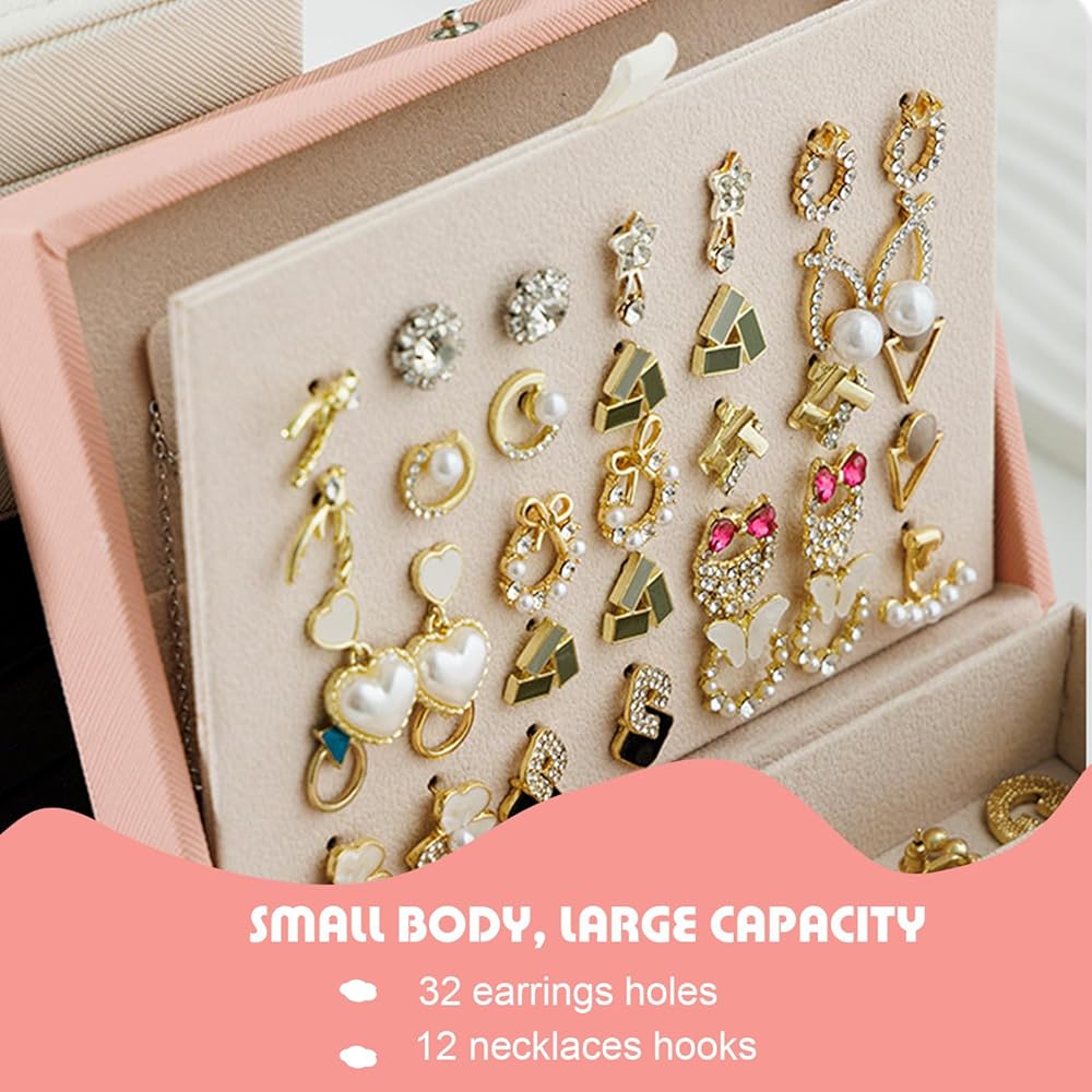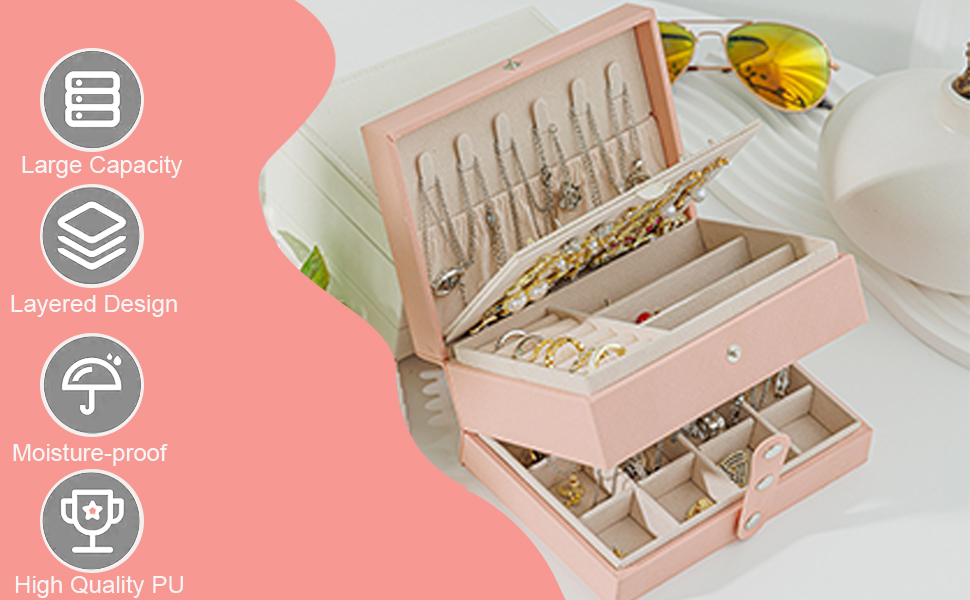 3-Layer Large Capacity Design:The 3-layer design efficiently stores your collection.The top lid section has 6 hooks and lower elastic pockets to hold necklaces, bracelets perfectly in place, and the middle section has a stud panel to hold more then 15 pairs of earrings. 7 ring rolls, 6 divided bottom compartment to store rings, bracelets, cuffs, earrings, studs, brooches, watches and other keepsakes.