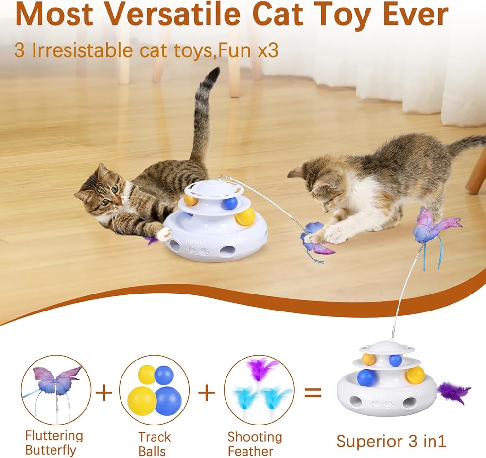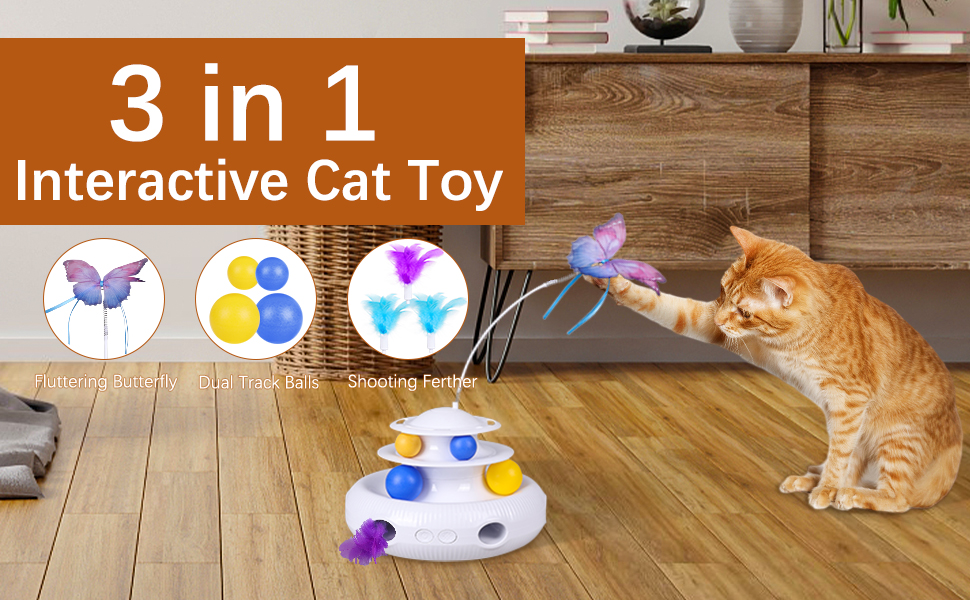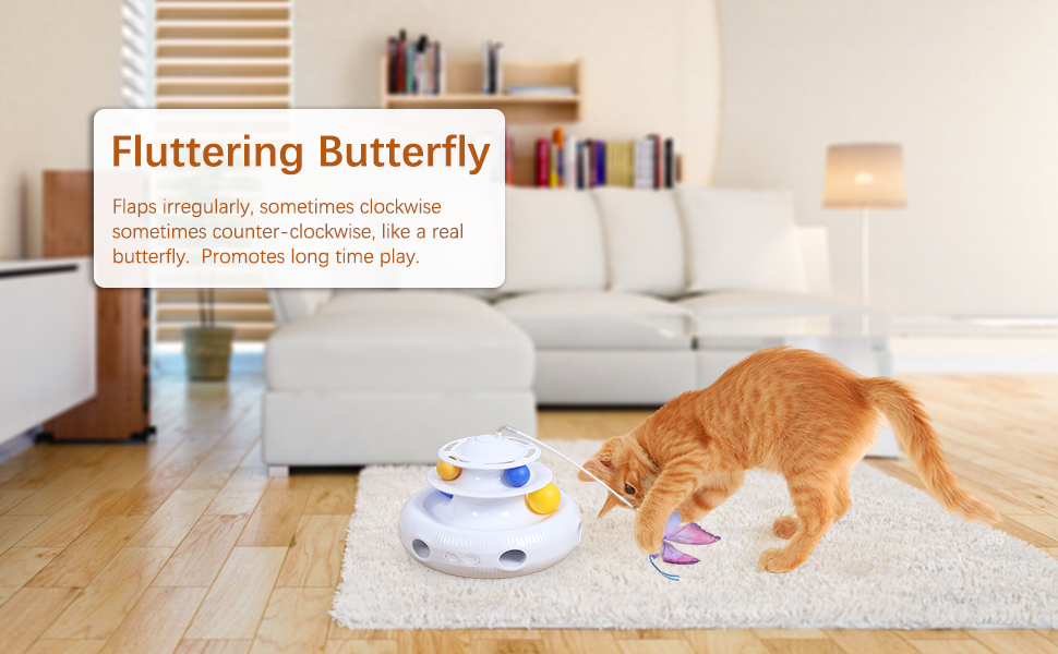 Cat Toys 3 In 1- shooting feather from random holes, flying butterfly and balls in the track. The fluffy feather keeps hiding and popping out from random holes, unpredictable movement stimulates cats to swat and play like a whack-a-mole game. Lifelike butterfly that flaps around in the air like real easily prompts cats to pounce and bat. The balls which you can put in the track add extra fun when cats stick their claws into the track and bat the balls