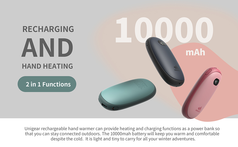 Recharging and Hand Heating 2 in 1 functions. Our electric hand warmer has both hand heating and recharging functions at the same time. The USB Type A and Type C ports at the top support 20W two way fast charging, USB Type A ( output ), Type C ( both input and output).
