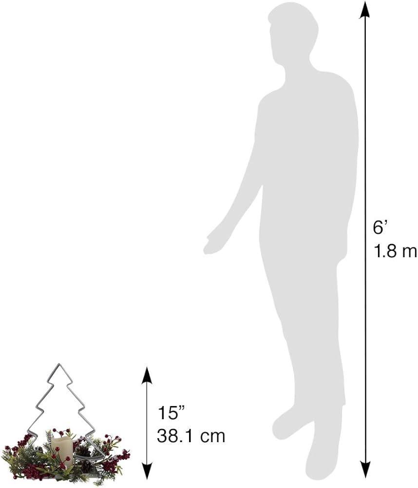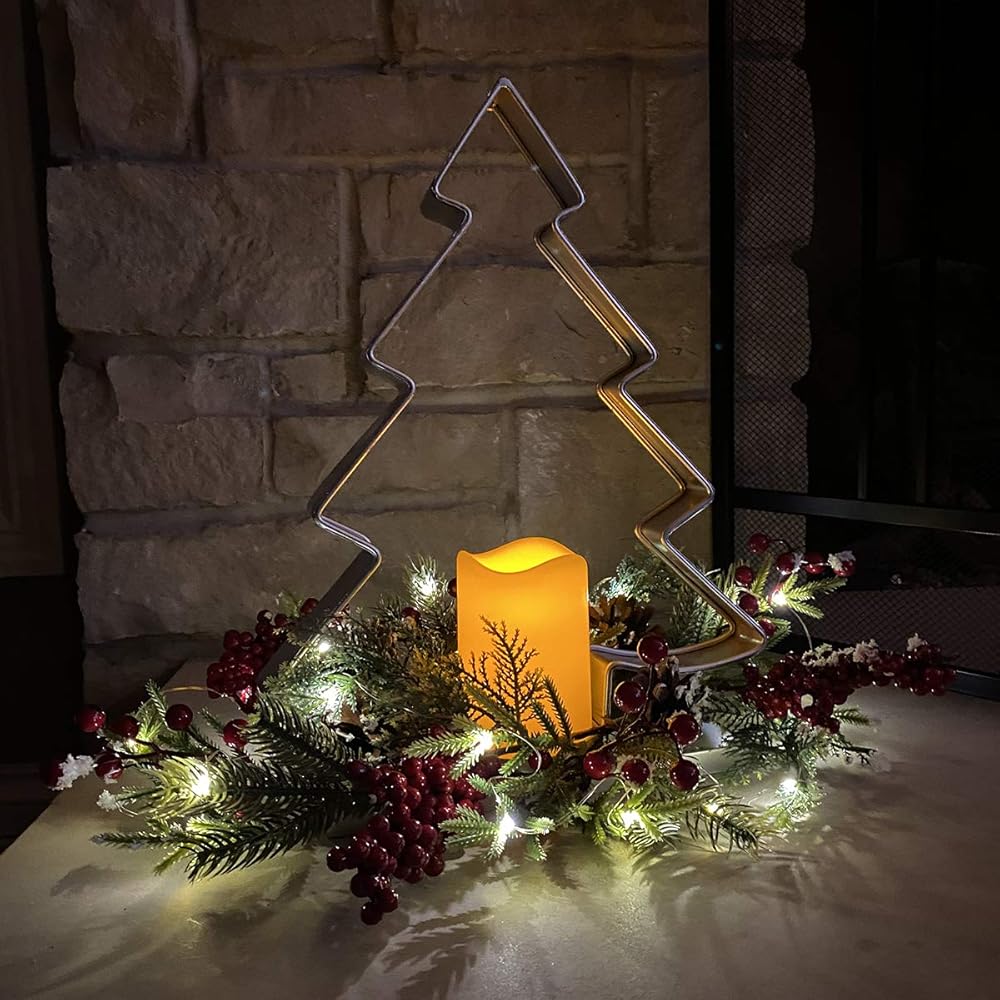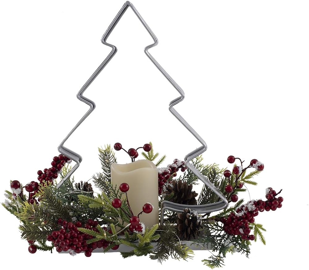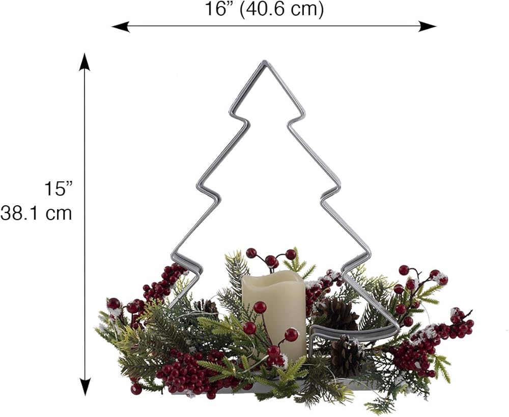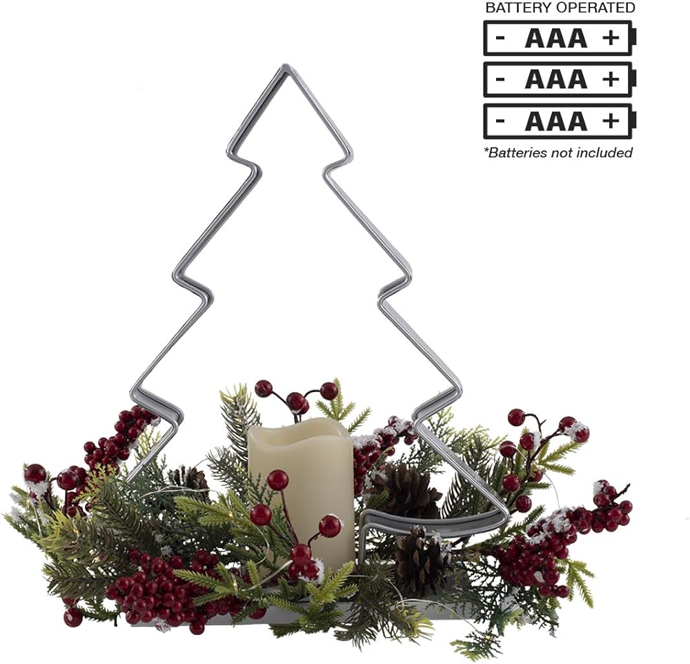 Allow this festive display to take center stage on any table or holiday display in your home this season. A beautiful pre-lit arrangement of faux pine, red berries and pinecones surrounds a flameless LED pillar candle with a silver Christmas tree outline. The strand of warm white microdot lights and LED candle are battery operated and feature a convenient on/off switch. The pillar candle provides a warm white glow and has a realistic flickering effect. This festive lighted centerpiece will make it easy to add holiday charm to any table, mantel, or countertop year after year.