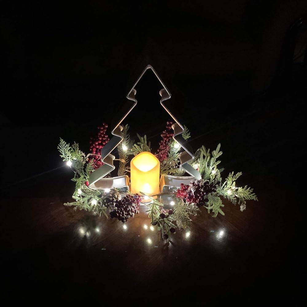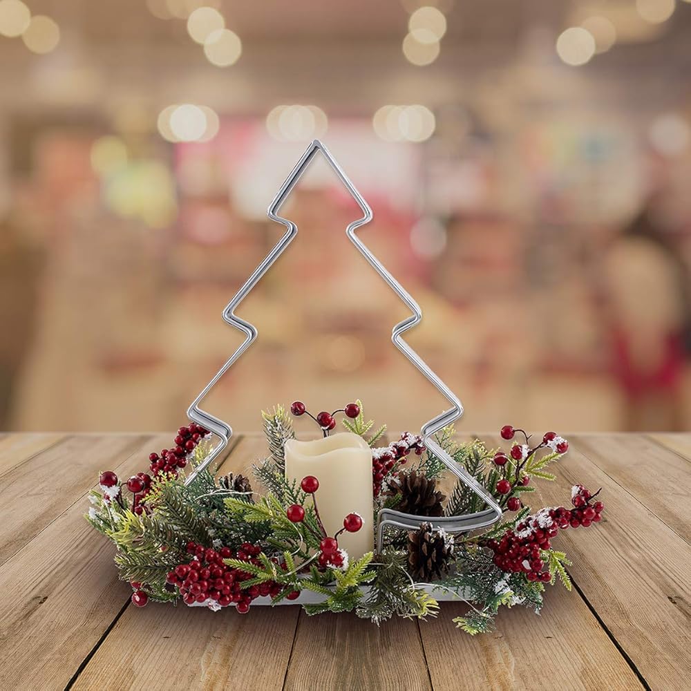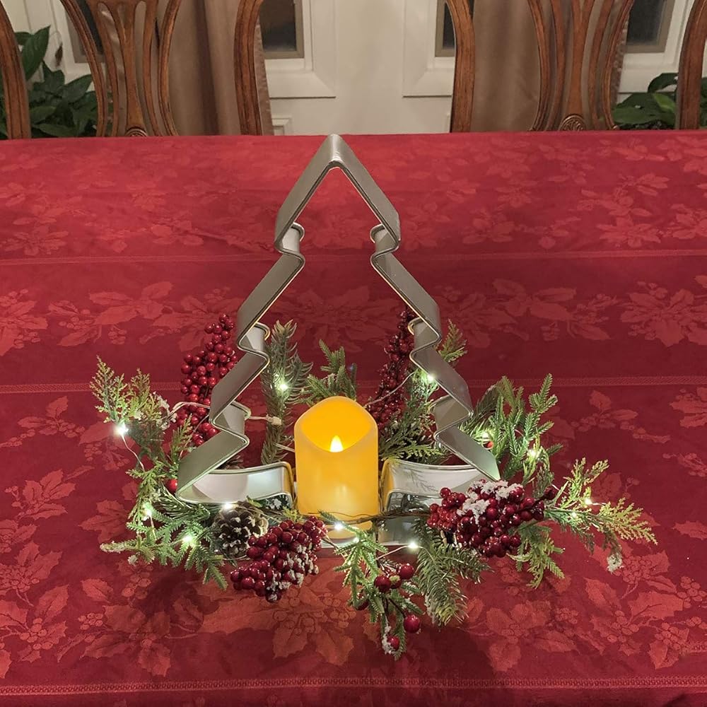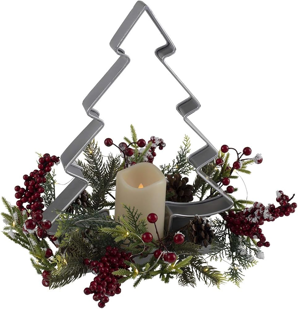 Allow this festive display to take center stage on any table or holiday display in your home this season. A beautiful pre-lit arrangement of faux pine, red berries and pinecones surrounds a flameless LED pillar candle with a silver Christmas tree outline. The strand of warm white microdot lights and LED candle are battery operated and feature a convenient on/off switch. The pillar candle provides a warm white glow and has a realistic flickering effect. This festive lighted centerpiece will make it easy to add holiday charm to any table, mantel, or countertop year after year.