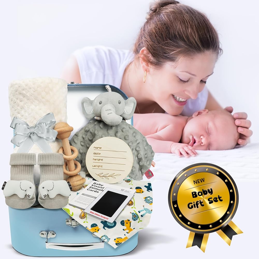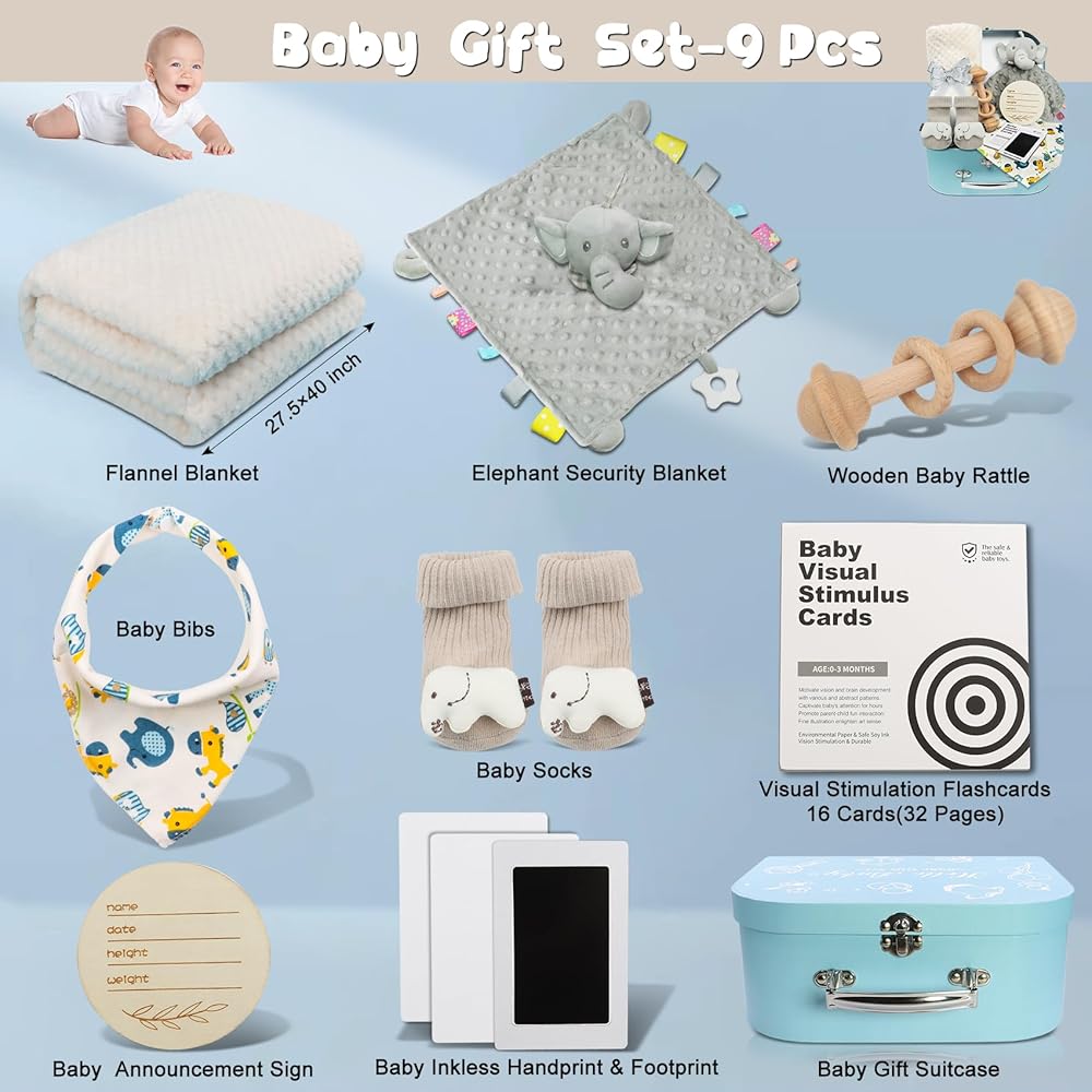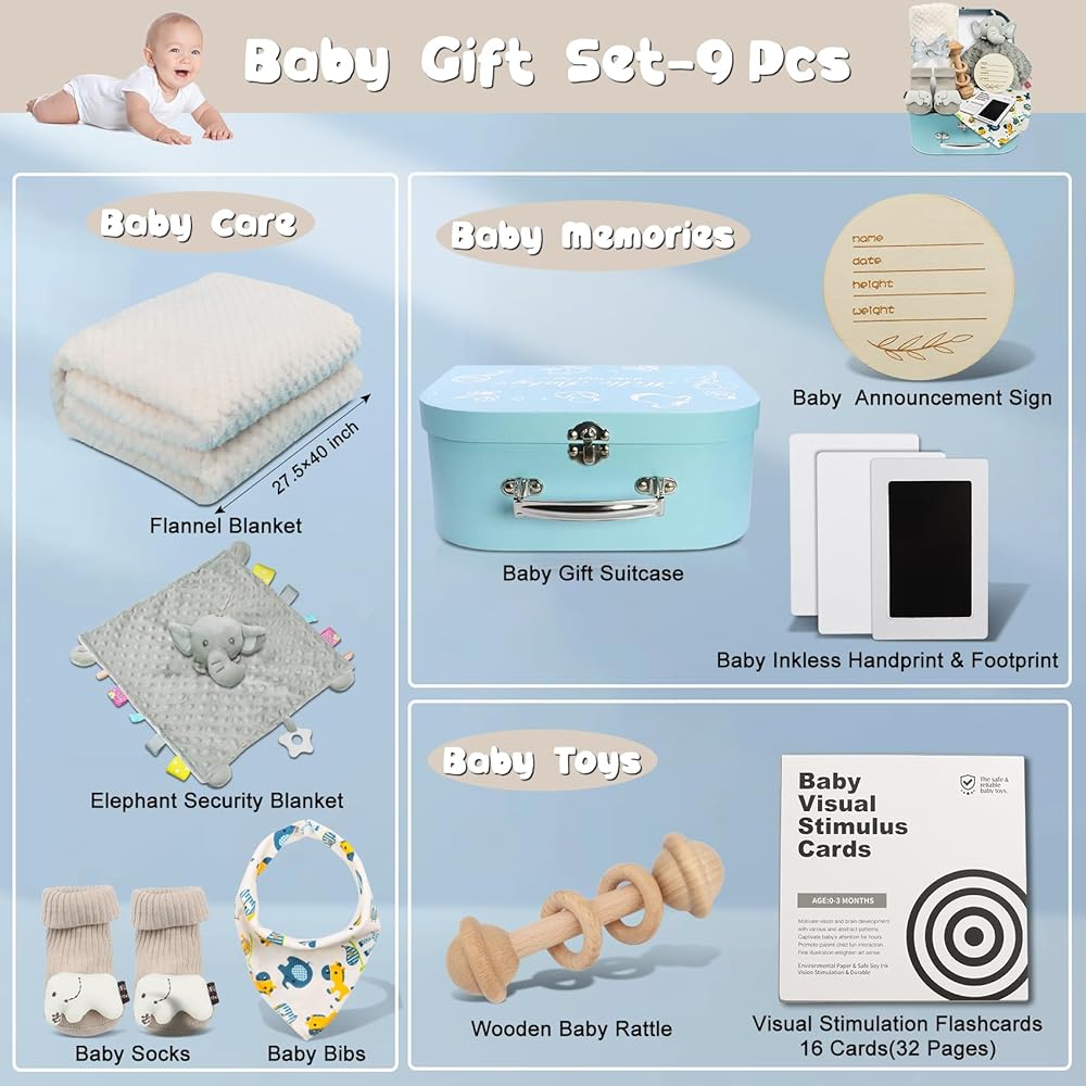 Thoughtful and Memorable: Our new mom gifts for women after birth is designed with love and thoughtfulness, from the flash cards encourage cognitive development, baby announcement sign, inkless hand and footprint kit allows you to capture precious moments of your baby's growth, and portable suitcase with metal handle. Whether for newborn baby or as baby shower gifts for mom, this set is all the perfect way to show your love and bless for new parents and their little babies.