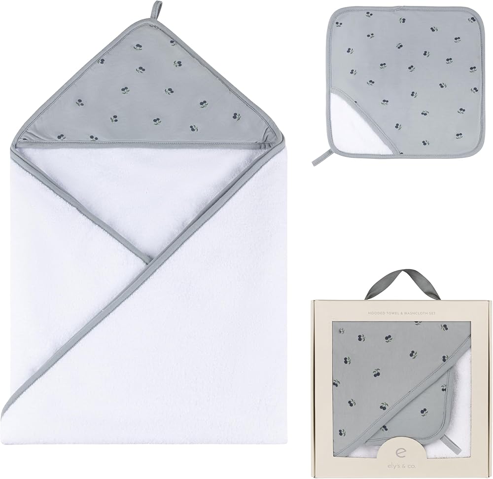 Hooded Towel & Washcloth Set: Ely's & Co. 100% Cotton Hooded Towel and Washcloth Set for Babies and Toddlers – Pink Cherries Ely's & Co. Cotton Terry Hooded Towel and Washcloth Set includes 1 (one) 35” x 35” hooded towel and 1 (one) 10” x 10” washcloth. Bundled in a chic, ivory gift-ready box, this essential bath time set makes for the perfect baby shower gift! This ultra-cozy, hooded towel and washcloth set features a sweet and whimsical, sage pear print on ivory jersey knit cotton embellished with a soft and neutral sage trim. Classic, comfortable and designed on-point with the latest fashion trends, this ultra-absorbent bath set is a must-have addition to your Baby Registry and modern décor. Made from 100% cotton terry and jersey knit cotton, our superbly soft and generously sized hooded towel provides baby with premium comfort and warmth ideal for use after bath time and at the pool or beach. The set's washcloth features a convenient pocket that parents can insert their hand into, making for a more efficient bath time. Not to mention, the washcloth comes with a hanging loop, useful for drying and storage. Both cotton terry and jersey knit requires minimal maintenance, making this set easy to care for and laundry a breeze. For best results, machine wash in warm water and tumble dry on low. Do not bleach these products. We recommend you wash this set before first use for ultimate absorbency and softness. This timeless set is suitable for infants and toddlers.