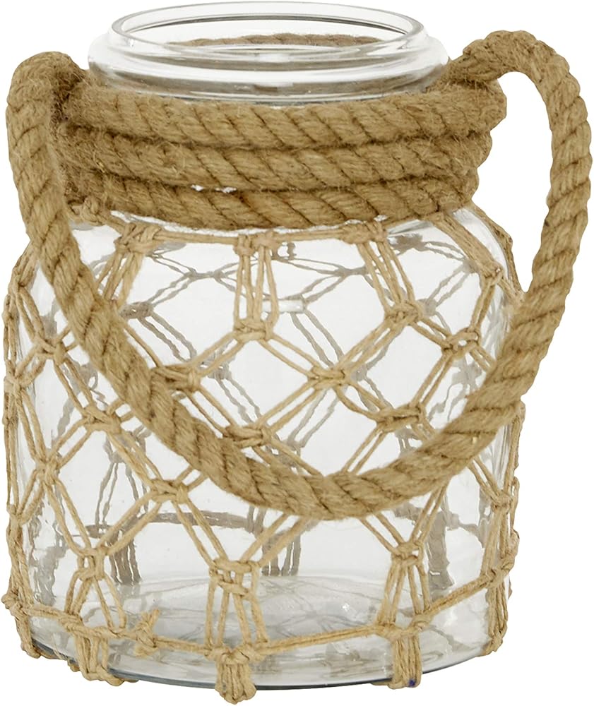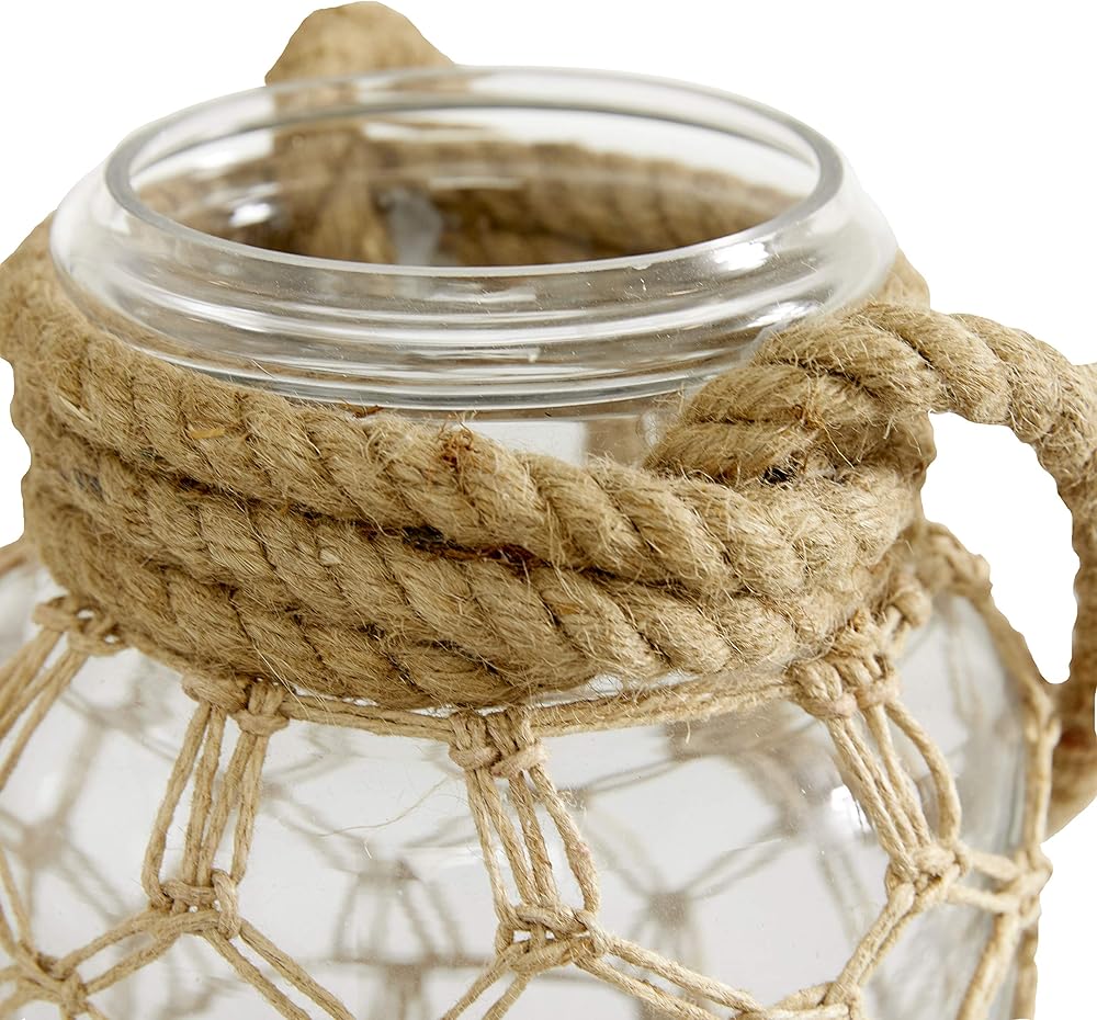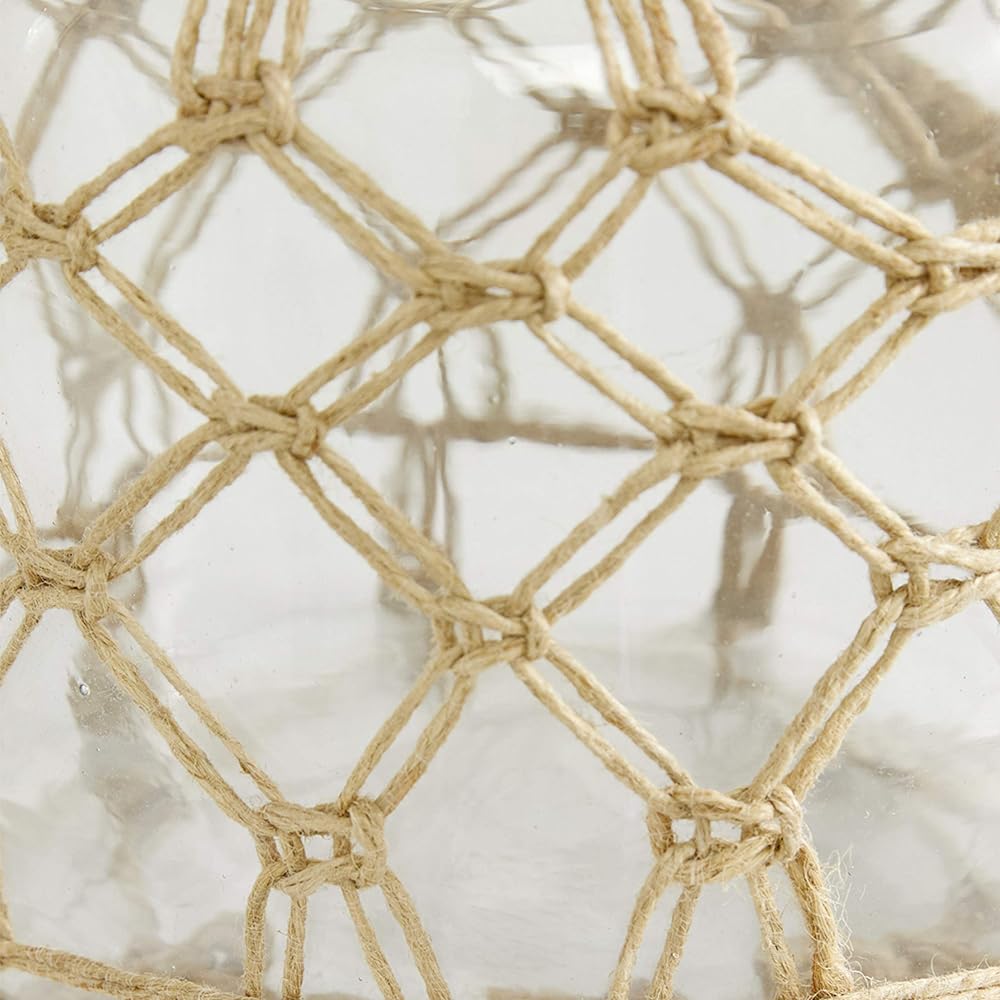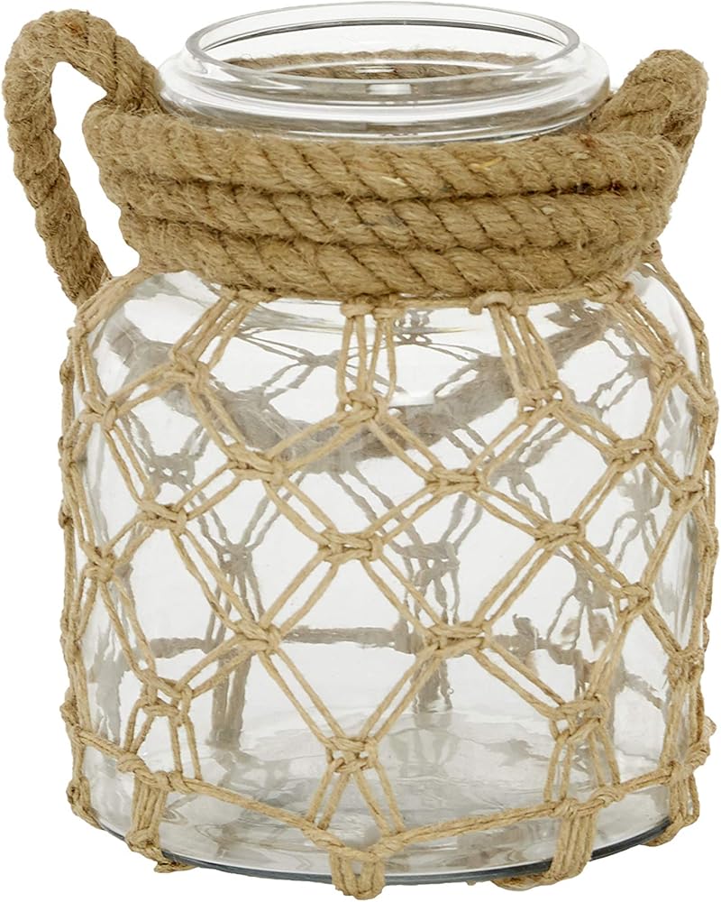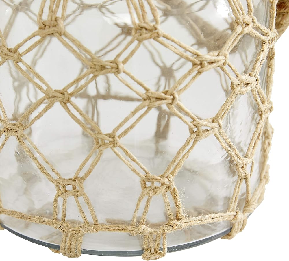 CLEAR AND BROWN GLASS FINISH Clear glass container is surrounded with diamond mesh patterned rope accents