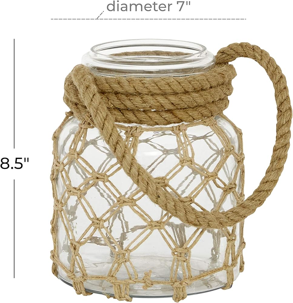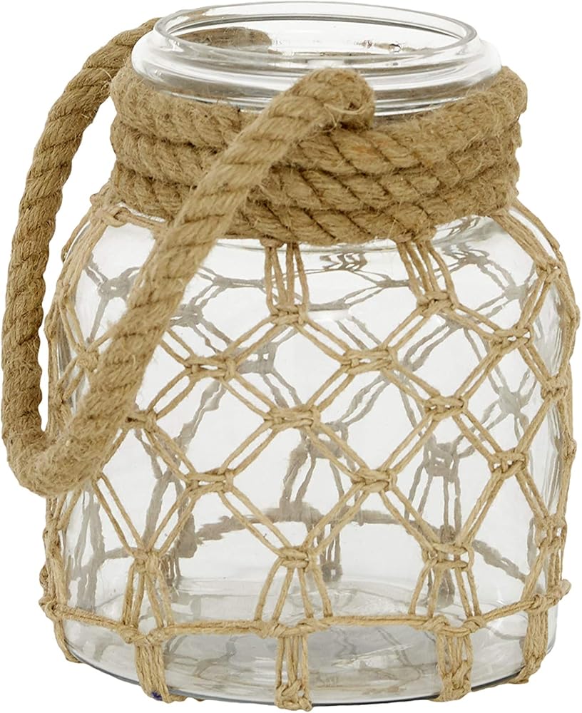 FEATURES IRREGULAR LANTERN Lantern features a thick rope hanger supporting a clear glass holder