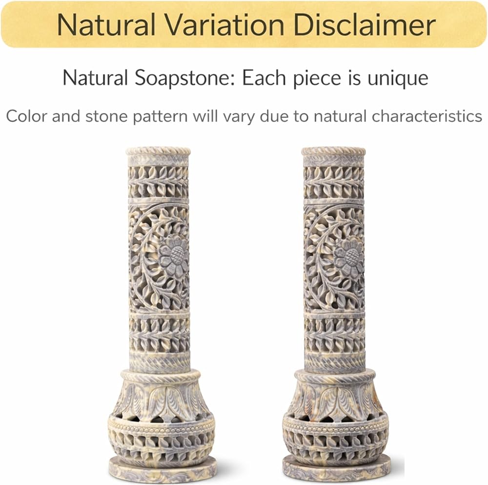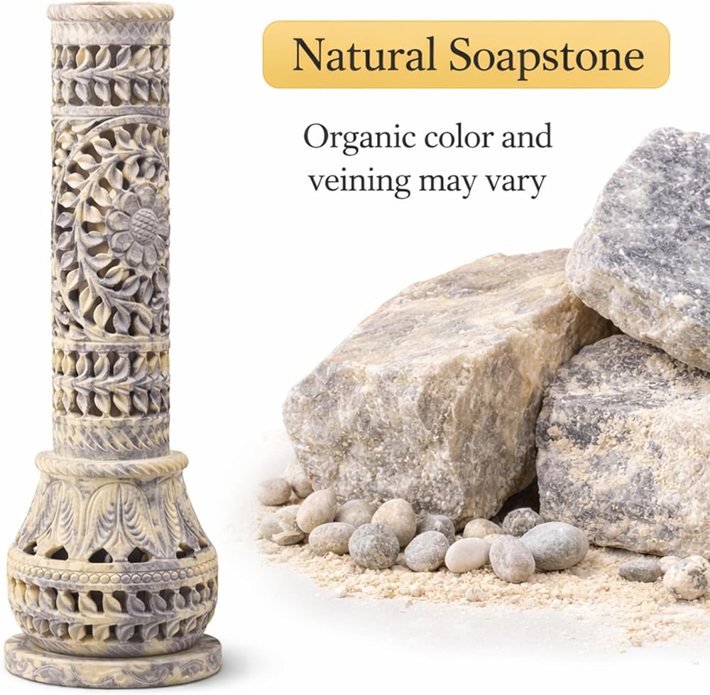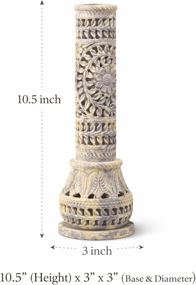 An intricately hand carved bottle shape incense stick holder made up of marble soapstone with multiple holes for holding incense sticks. This Incense Cone holder also has a provision to hold a candle.