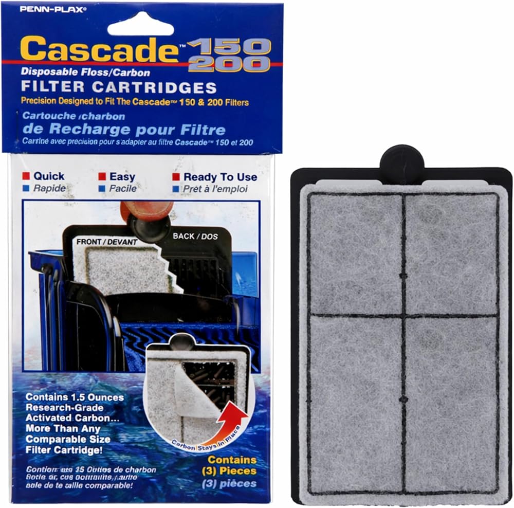 The Penn Plax Cascade 150 or 200 GPH Filter Cartridges with Activated Carbon will improve the quality of your aquarium water and keep your fish healthy. This 3 Pack of Filter Cartridge Replacements is designed to fit both Cascade 150 / 200 GPH hang-on power filters and will last 6 to 12 weeks depending on the conditions of your fish tank. Activated carbon is great for freshwater aquarium filtration. It has the ability to not only visually clear the water; but trap pollutants in the pores of the carbon so they do not enter the water. This filter cartridge will remove ammonia; nitrites; odors and other harmful toxins from your aquarium to keep it healthy. It has a poly-fiber floss barrier which screens out particulate matter and debris for an extra layer of protection. Within 24 hours you will see a drastic difference in the water quality. Each filter cartridge is perfectly measured to fit into the Cascade 150 / 200 Hang On Filter tray without any gaps preventing debris and contaminants from entering back into the water. This filter cartridge is suitable for both freshwater and marine environments. When used together; the Cascade 150 Model CPF3 / 200 Model CPF4 Filters and Cascade filter cartridges provide maximum protection against water pollutants from harming your fish. This is for one package with three replacement cartridges.