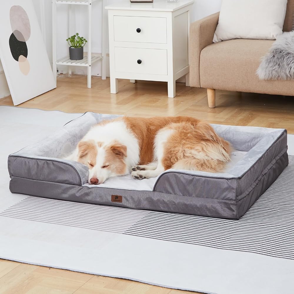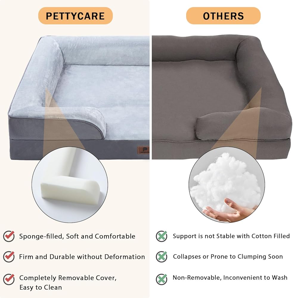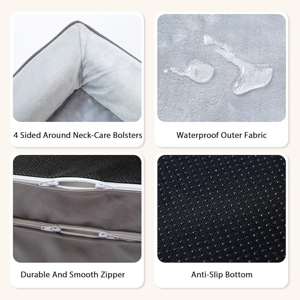 pettycare Orthopedic Dog Bed for Large Dogs - Bolster Egg Crate Foam Dog Sofa with Waterproof Removable Washable Cover, Non-Slip Bottom, Extra Head and Neck Support, Grey, 42inch