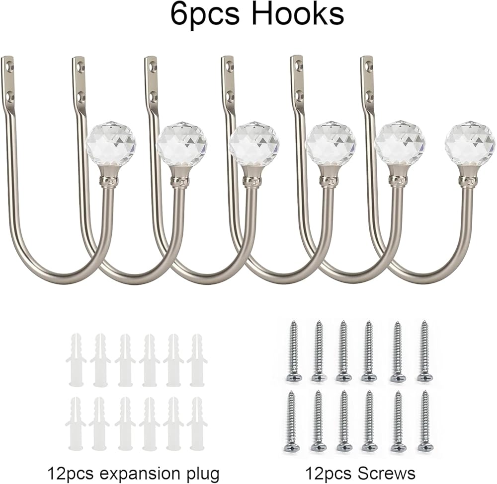 Crystal curtain tiebacks fit for most of Curtains:Hook height: 5.9inch/15cm,hook width: 2.95inch/7.5cm.This size is suitable for thick or heavy curtains, no straps needed. Easily holdback or release curtain on both sides of the window. The U-shaped curtain tieback hooks adopts a double-hole design to reinforce the load-bearing capacity, not easy to fall, and the load-bearing is stronger.
