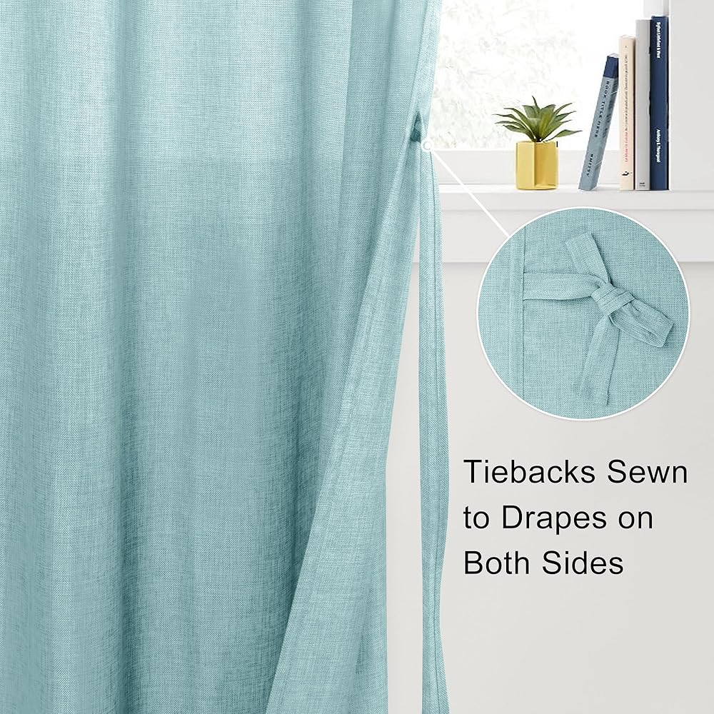 Package Includes: 2 pack faux linen curtains. Each panel measures W52 x L84 inches long. Each panel is constructed with 3 inches rod pocket on top.The semi sheer curtains come with exclusive designed tiebacks on both sides, it's easy to tie the curtains together.