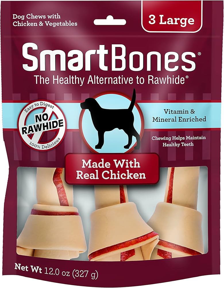 SmartBones Chicken Dog ChewRawhide-Free Dog Treat Taste Dogs Love! The Smart Alternative To RawhideChewing is an essential, healthy and enjoyable activity for dogs. Dog chews help keep teeth clean, jaws strong and are mentally stimulating to help prevent boredom and destructive behavior. As a pet parent, you should ensure that you satisfy your dog's natural chewing instinct in a safe and satisfying way. Many veterinarians are concerned with the potential health risks associated with dogs consuming rawhide. These health risks include, stomach & intestinal blockage and potential ingestion of toxic chemicals used to process rawhide chews. In addition, there are serious negative environmental issues generated by the use of chemicals in processing rawhide products.