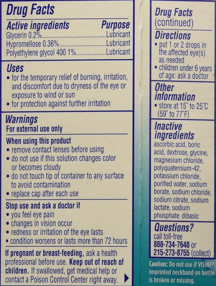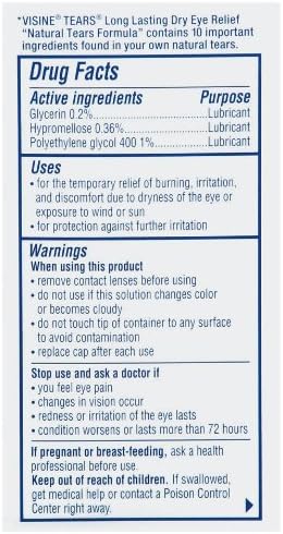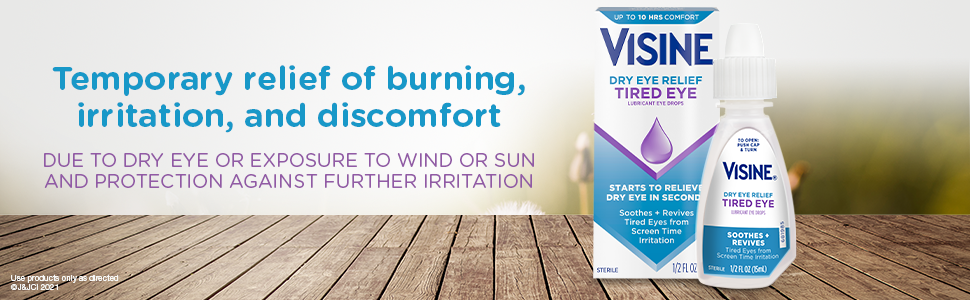 Visine Tired Eye Dry Eye Relief Eye Drops soothe and revive tired, overworked eyes. Made with a unique formula featuring multiple hydrating moisturizers, these eye drops work to protect eyes for up to 10 hours of comfort. They provide relief for burning, irritated, or dry eyes after getting a poor night's sleep, staring at a computer screen for long periods of time, or spending too much time in the wind or sun. From Visine, a brand backed by 60 years of science and expertise, the eye drops are available in a convenient size that easily slips into a bag or purse, so you can soothe your tired eyes anywhere, even on-the-go.