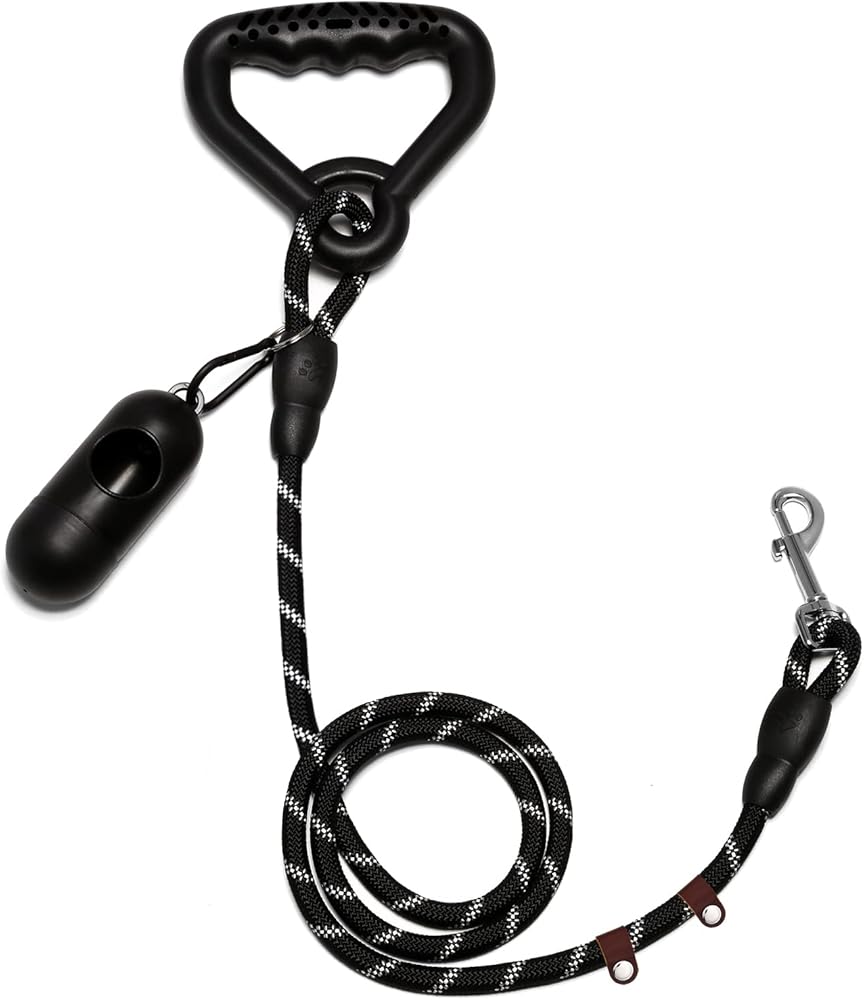 Wakytu Ergonomic Design Handle Dog Leash, Reflective Dog Leash for Small Medium and Large Dogs, Strong Dog Leash with Waste Poop Bag Holder, Traction Collar for Walking, Black, 6'×1/2''