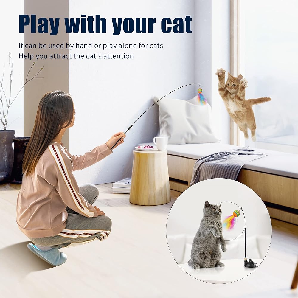 Package Details and Asserance: 2 X interactive cat wand, 2 cat toys suction cup, 6 rainbow ball feather replacement head. Please check your item when you receive it. Please tell us immediately if any parts are missing. We will give you a refund after confirmation.