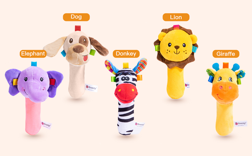Newborn Baby's First Rattles - Plush animals hand rattle with soft teething surfaces, no smell, non-toxic, BPA free and safe for babies. Baby can playing in anywhere such as outdoor, indoor, even in the car.