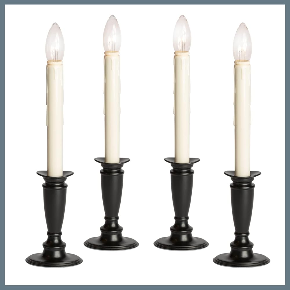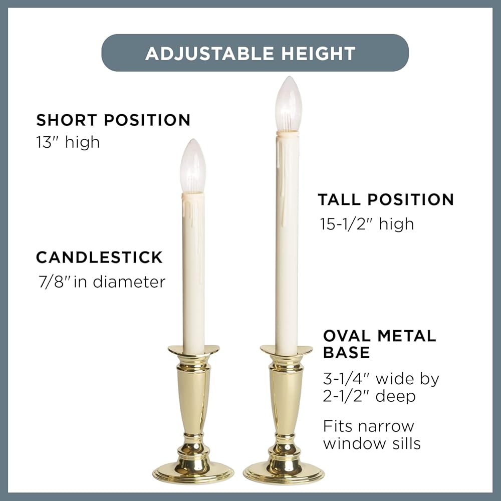 The new Celestial Lights battery-operated window candle is our new premium window candle option. Featuring a dual-intensity LED bulb that shines bright on the street side while dimly lighting the inside of your home. Now, with the included remote control, you may choose your light setting, either twinkle or steady. You may also change your daily timer setting to be either 6 hours, 8 hours, or 12 hours ON. Each candlestick features a slim design metal base and adjustable height feature. For indoor use only.