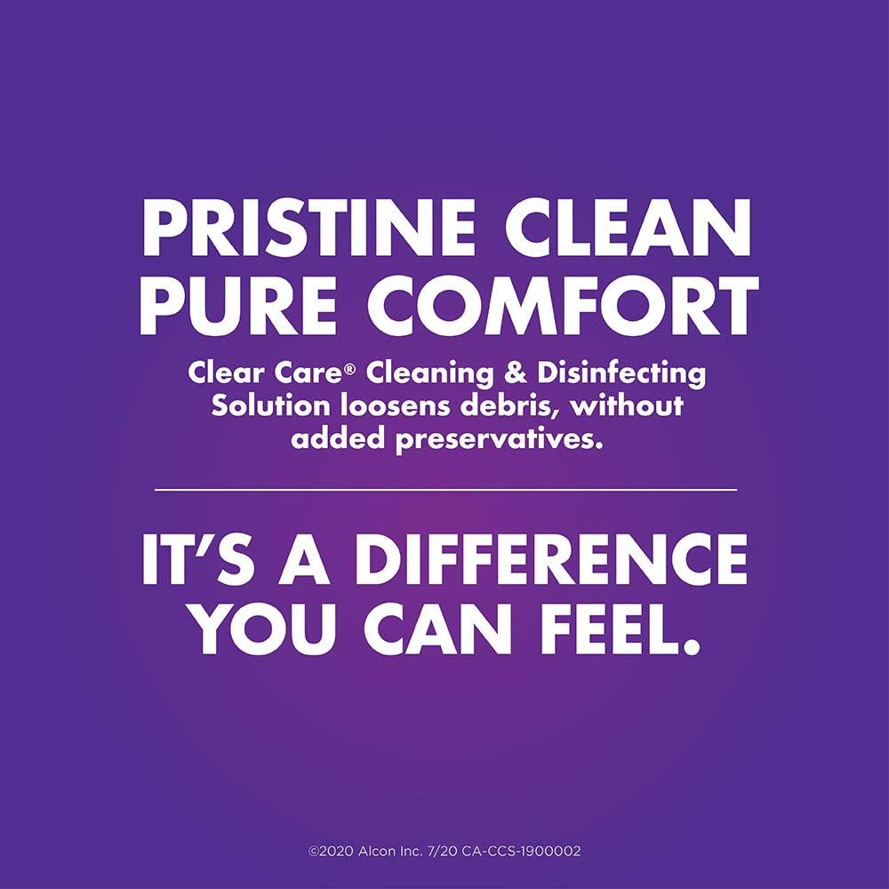 Clear Care Contact Lens Solution 360 ml Pack of 2 Clear care lens solution Clinically proven #1 in comfort Exclusive cleaning formula The power of hydrogen peroxide Gentle comfort even for sensitive eyes Clear Care cleaning and disinfection solution does more than just clean contact lenses, it delivers pristine clean and pure comfort, with no added preservatives. The clear care solution system is easy to use and works seamlessly for a pristine clean - so your lenses feel like new every day. And nothing feels better than a fresh, new pair of contact lenses. Clinically proven #1 in comfort. Available in twin pack of 360-milliliter.