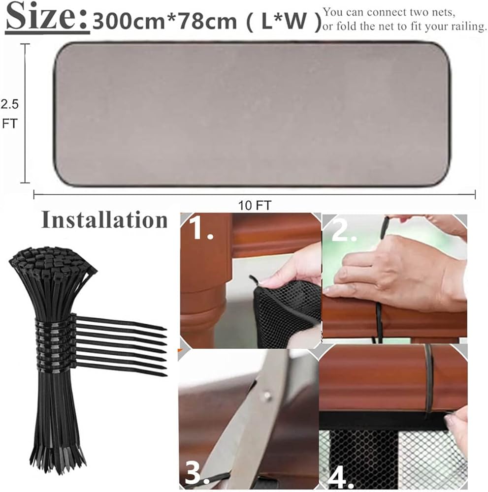 【 Super Child Balcony Safety Net 】10 feet long x 2.5 feet high, fits most banister, stair railing, balcony, patios, etc. You can connect two or more net using the same installation way.