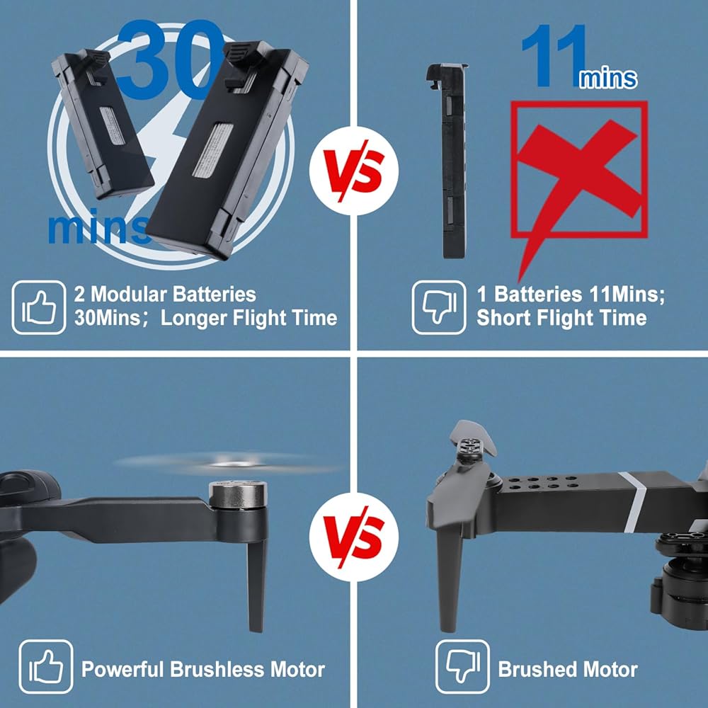 【Extended Battery Life】Compared with other drones, this drone matches with 2 modular batteries that support long flight time and can be used alternately over 30 minutes, allowing you to enjoy longer flight fun.