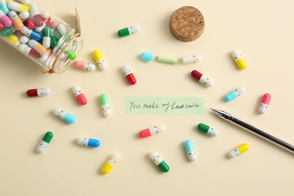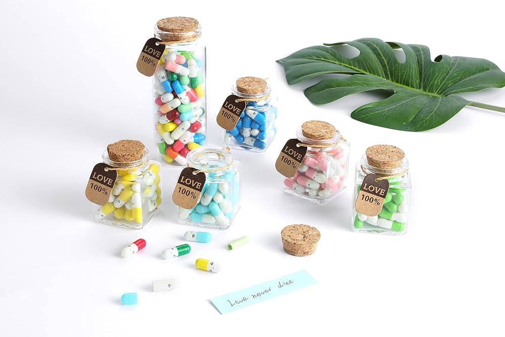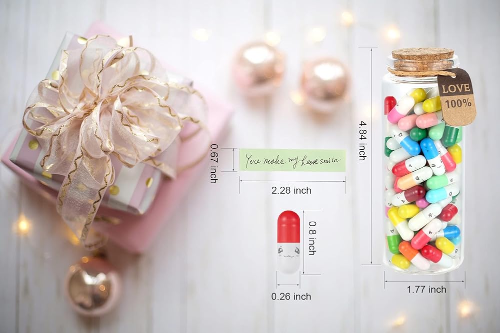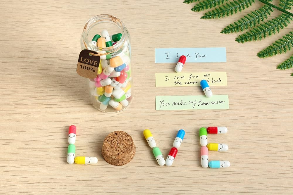 💘Small,but Durable:Paper is small,but perfect for one sentence and can open one daily or whenever make him/she smile.These little pills are so cute with the 4 different faces on them.