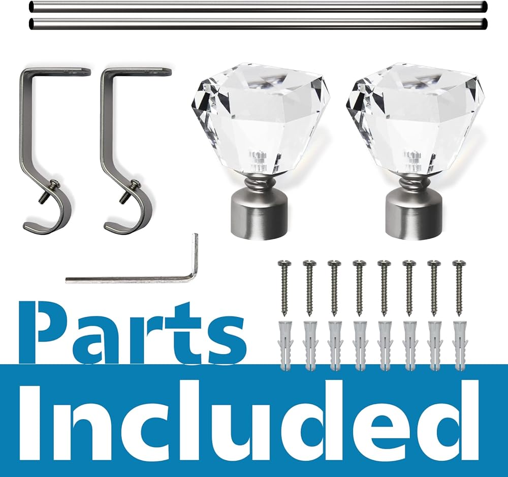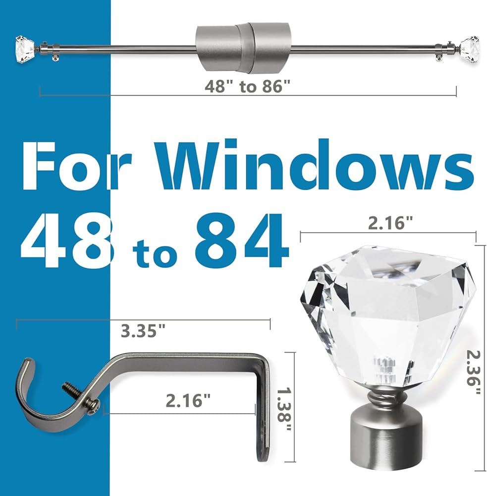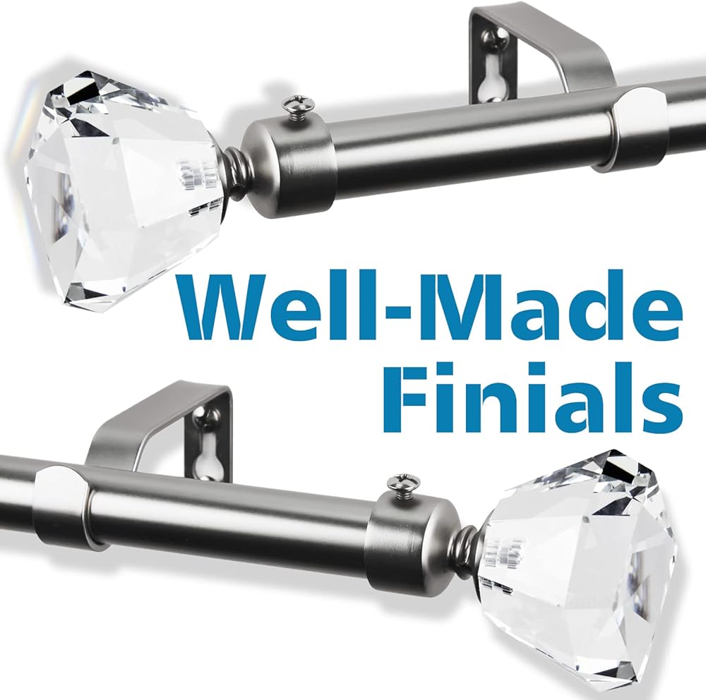 Curtain Rods for Windows 66 to 120, Silver Curtain Rods with Acrylic Diamond Crystal Finials, Brushed Nickel Curtain Rod, Decorative Curtain Rod, Adjustable Curtain Rod.