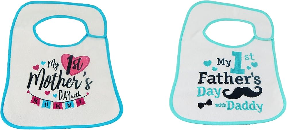 This 2-pack of cotton blend bibs features the holidays of Mother's Day and Father's Day. These soft and delicate bibs are made from 100% cotton to absorb all of your baby's spits, dribbles, and spills. The hook-and-loop closure makes putting them on and taking them off a breeze and, since they are adjustable, will fit babies of all shapes and sizes. Holidays included: Mother's Day and Father's Day.