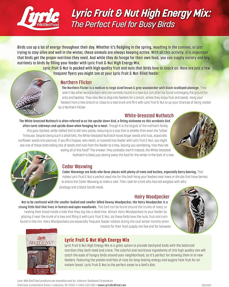 Lyric Fruit and Nut Wild Bird Food contains no fillers and provides high energy. Attracts chickadees, robins, orioles, blue jays, titmice, buntings, cardinals, grosbeaks, towhees, nuthatches and Cedar Waxwings. Contains nuts, roasted and shelled peanuts, Valencia peanuts, almonds, pecans, cashews, pistachios, cranberries, raisins, sunflower kernels, shelled pumpkin seeds, crimped corn.