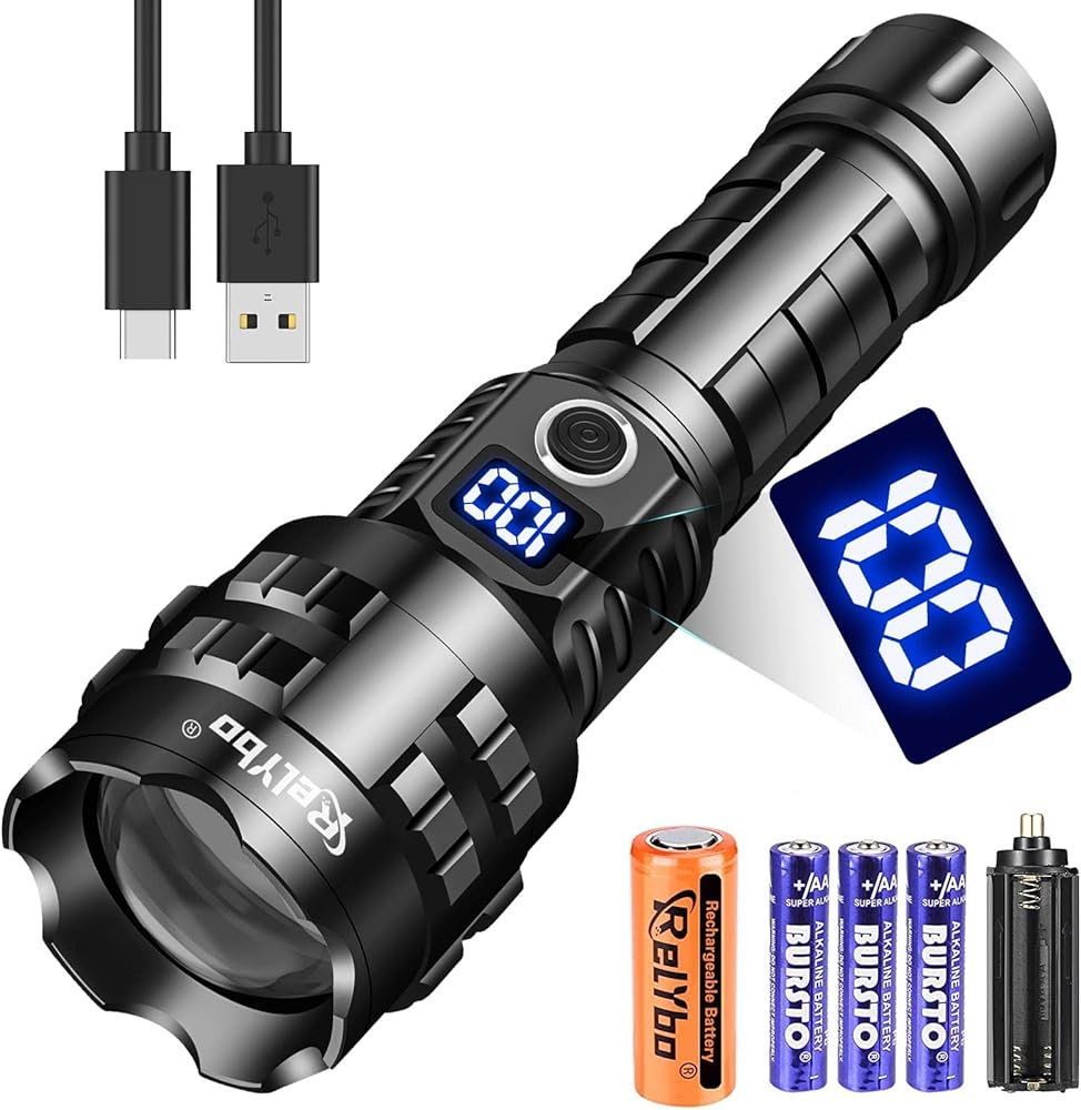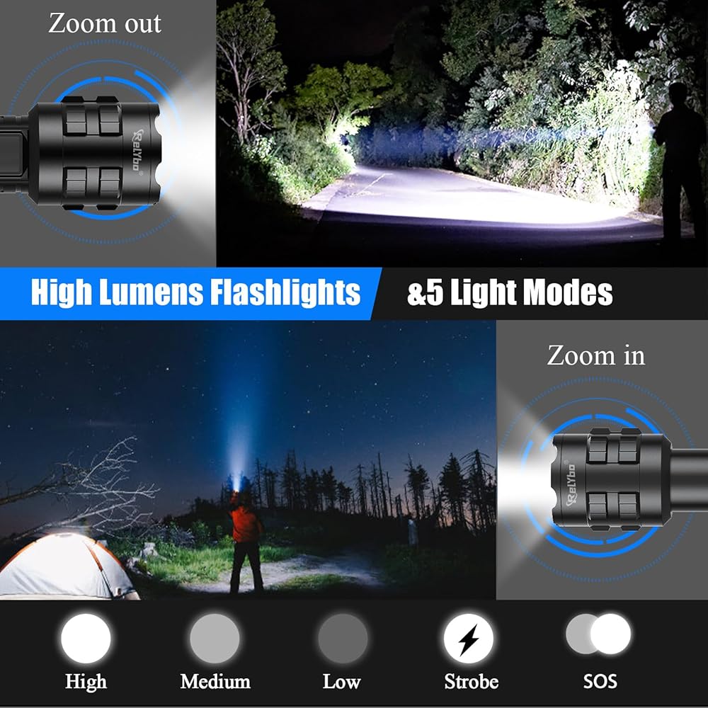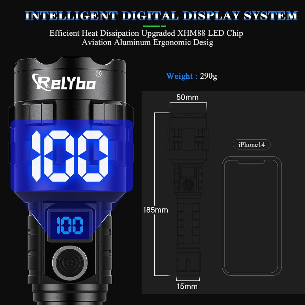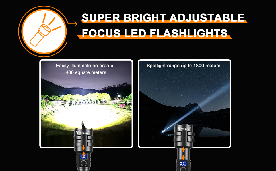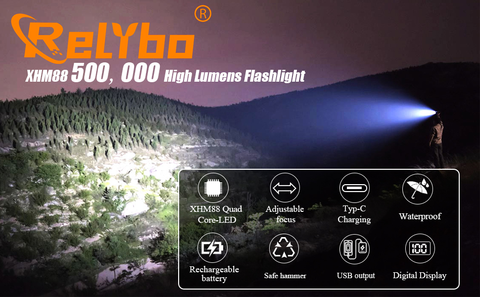 【FLASHLIGHTS HIGH LUMENS】The Relybo rechargeable flashlights equipped with XHM88 quad-core chip is capable of producing an output of 500,000 lumens, the flash light feature zoomable function, you can get the long distance beam and large range beam by stretching the powerful torch to adjust the focal length. Its high beam can easily illuminate 400square meters room like a giant light wall or focus on objects 1800 meters away like a long distance lightsaber.