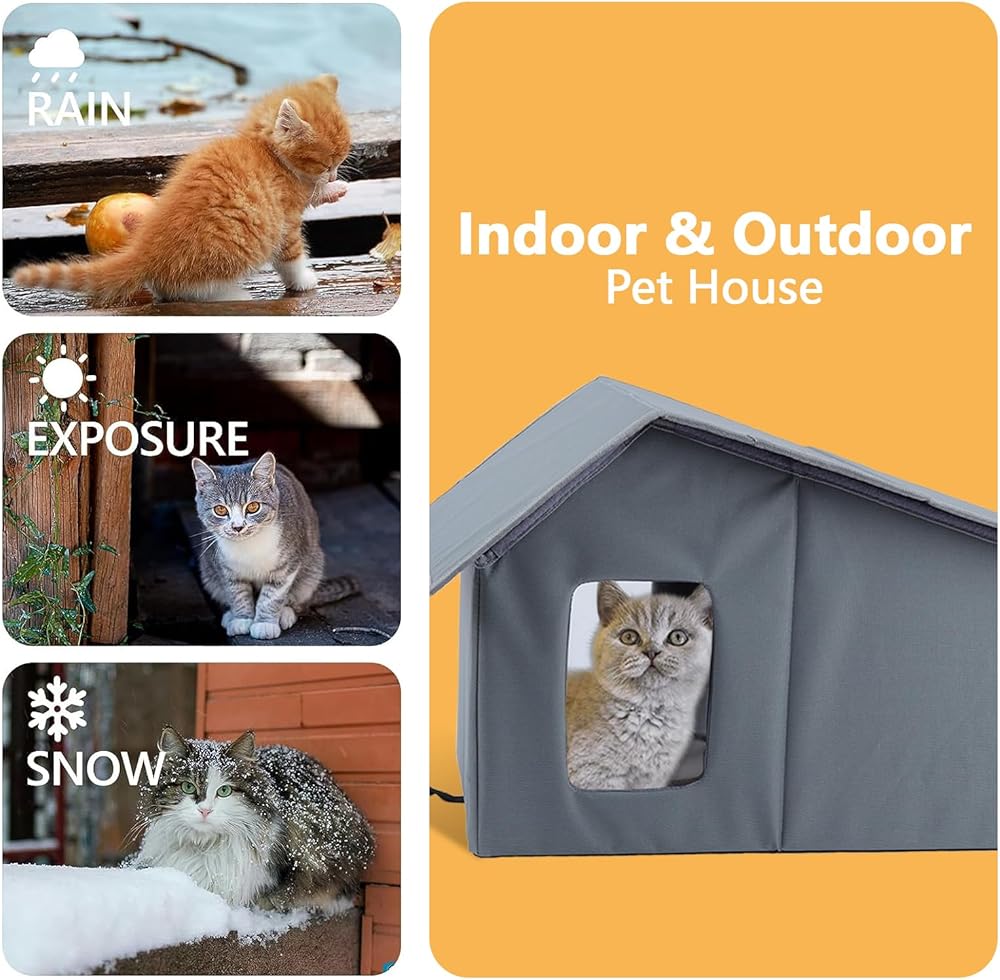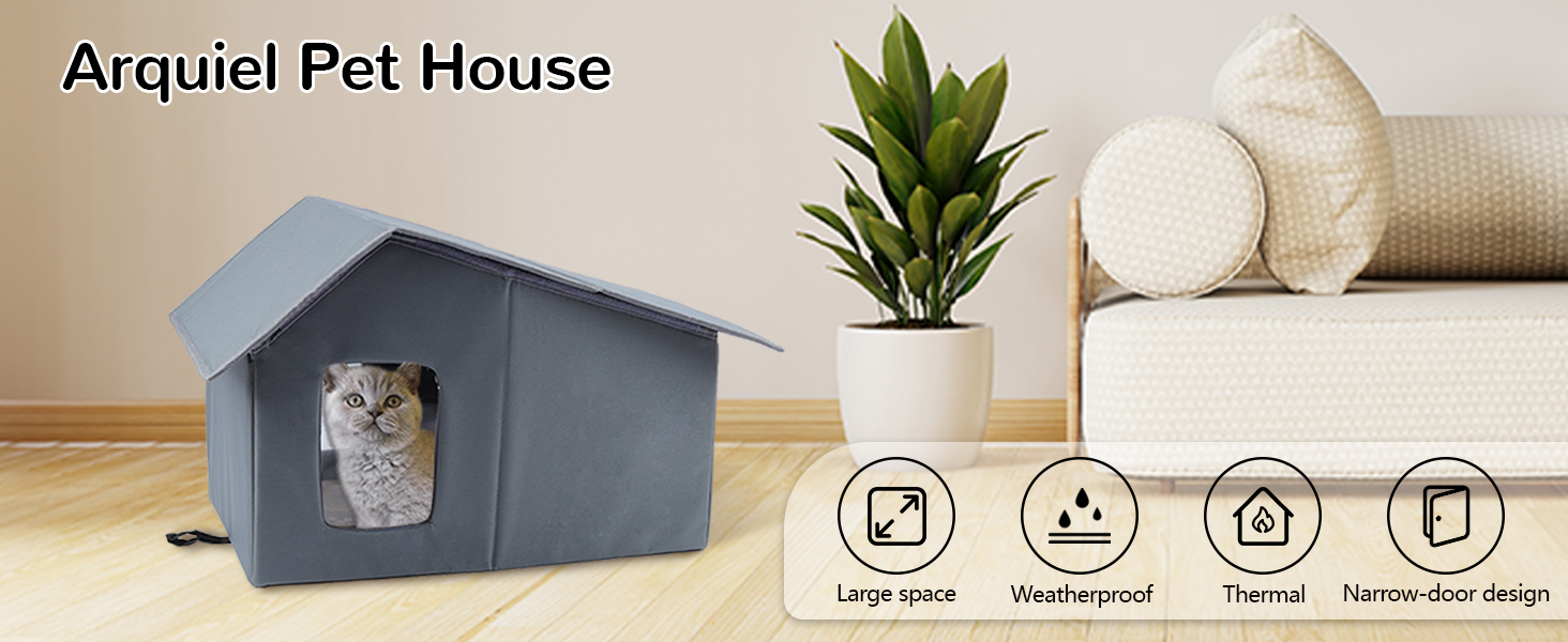 【WEATHERPROOF STRAY CAT HOUSE】Arquiel outdoor cat house is made of durable and waterproof Oxford material, with a waterproof layer on the outside, which is 100% waterproof. With transparent door curtains, it can effectively prevent the invasion of cold wind.