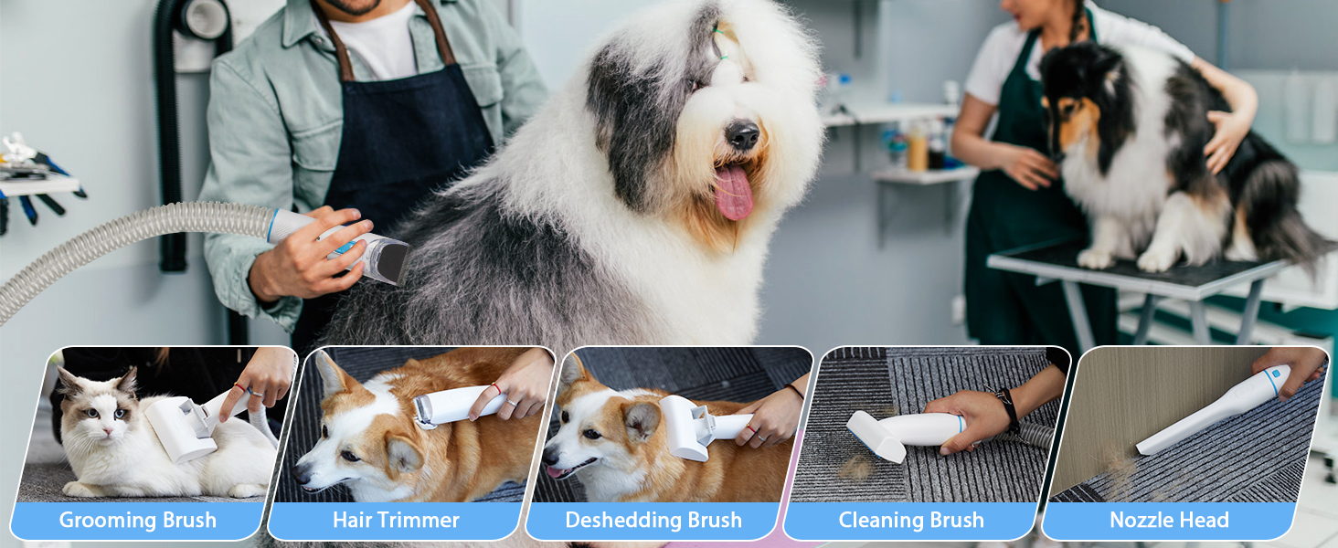 🐕【Vacuum Suction 99% Pet Hair】Compared to traditional pet grooming kits they will bring all the hair mess to your house. But our M01 dog grooming kit with vacuum function collects 99% of pet hair into a vacuum container while trimming, brushing, and de-shedding, which can keep your home clean, and there's no more tangled hair and no more piles of fur spreading all over the house.