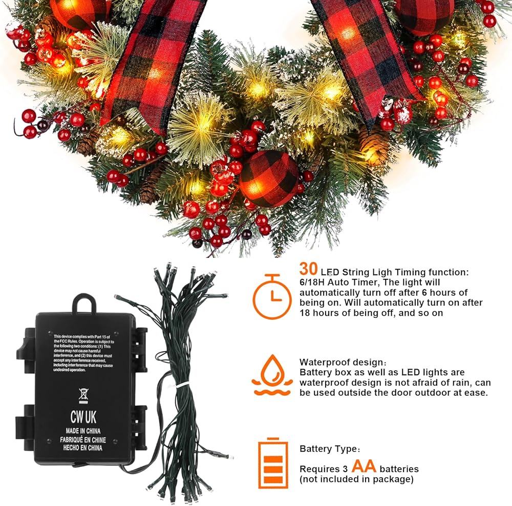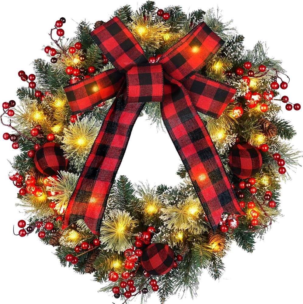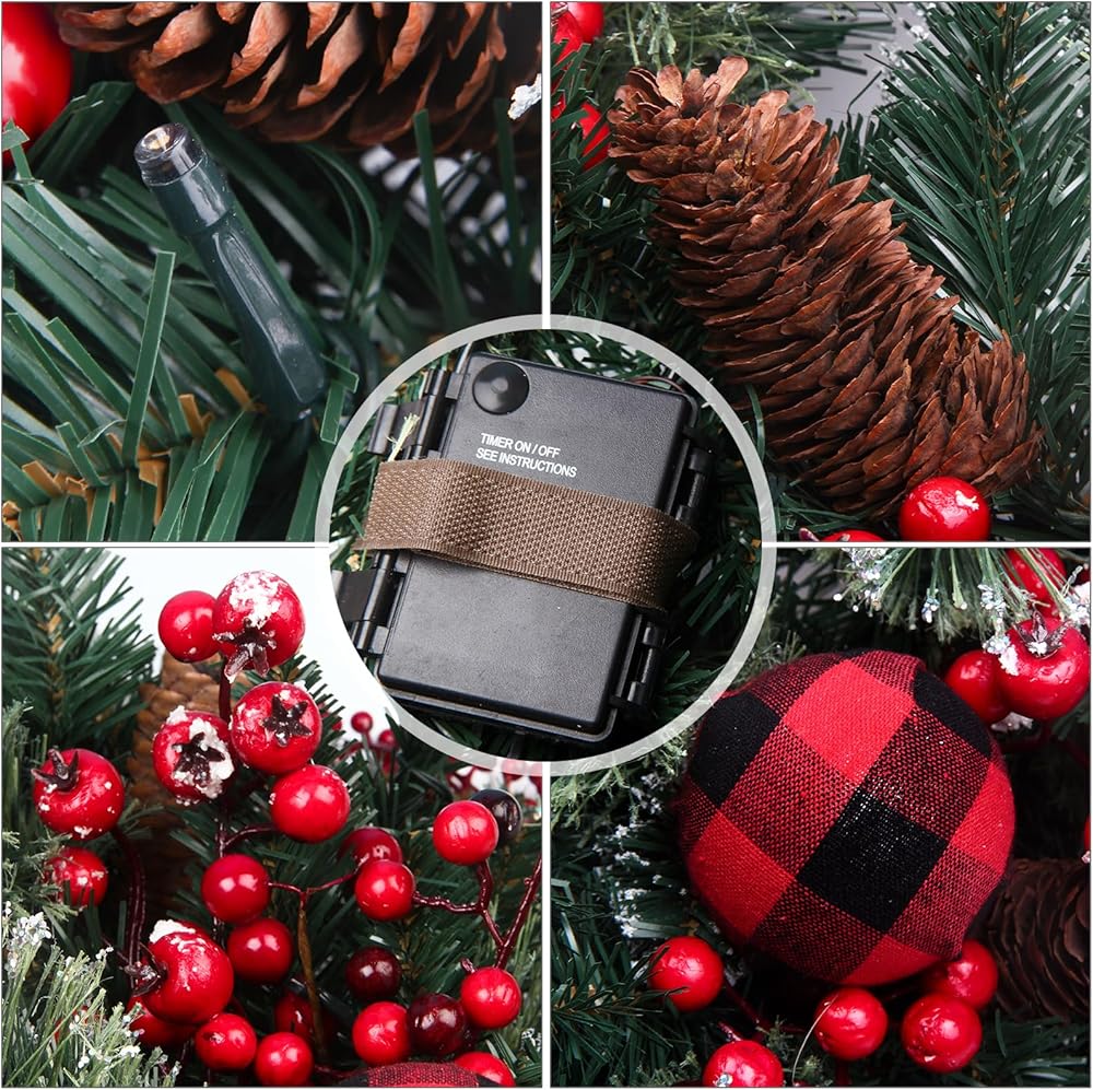 Chrisxiao 24 Inch Christmas Wreath for Front Door, Christmas Wreaths with Pine Cones, Berry Clusters, Frosted Branches and Red Bow, ffor Home Door Window Wall Indoor Outdoor Christmas Decoration